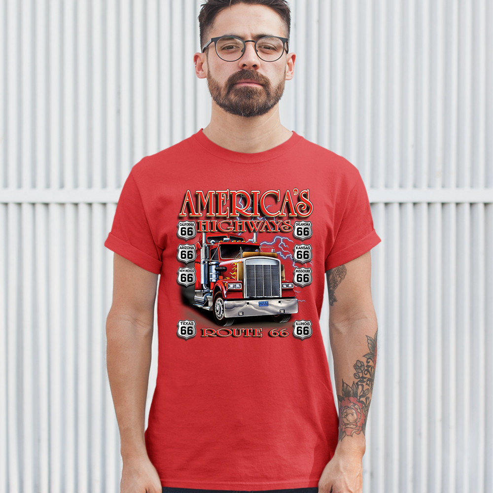 AMERICA'S HIGHWAYS ROUTE 66 t-shirt truck driver mechanic teamster men's tee red
