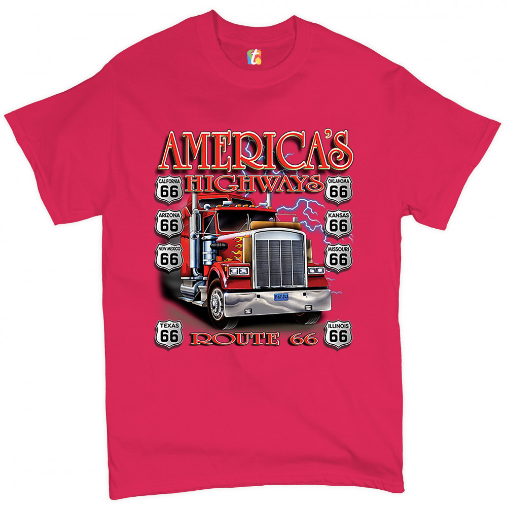 AMERICA'S HIGHWAYS ROUTE 66 t-shirt truck driver mechanic teamster men's tee hot pink