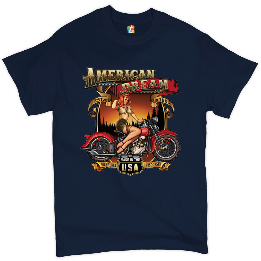 A print featuring a sexy pin up girl sitting on a vintage motorcycle. The print says: "American Dream est. 1903". In the bottom there is a sign saying: "made in the USA". To the left and right of it "Milwaukee Wisconsin" is written on a stripe. Great choice for any motorcycle enthusiast.