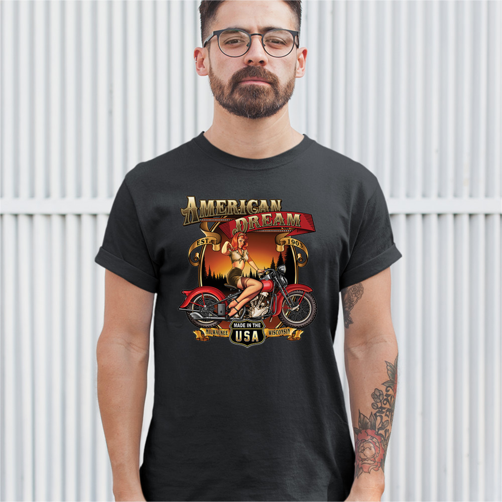 A print featuring a sexy pin up girl sitting on a vintage motorcycle. The print says: "American Dream est. 1903". In the bottom there is a sign saying: "made in the USA". To the left and right of it "Milwaukee Wisconsin" is written on a stripe. Great choice for any motorcycle enthusiast.