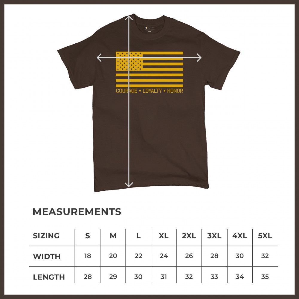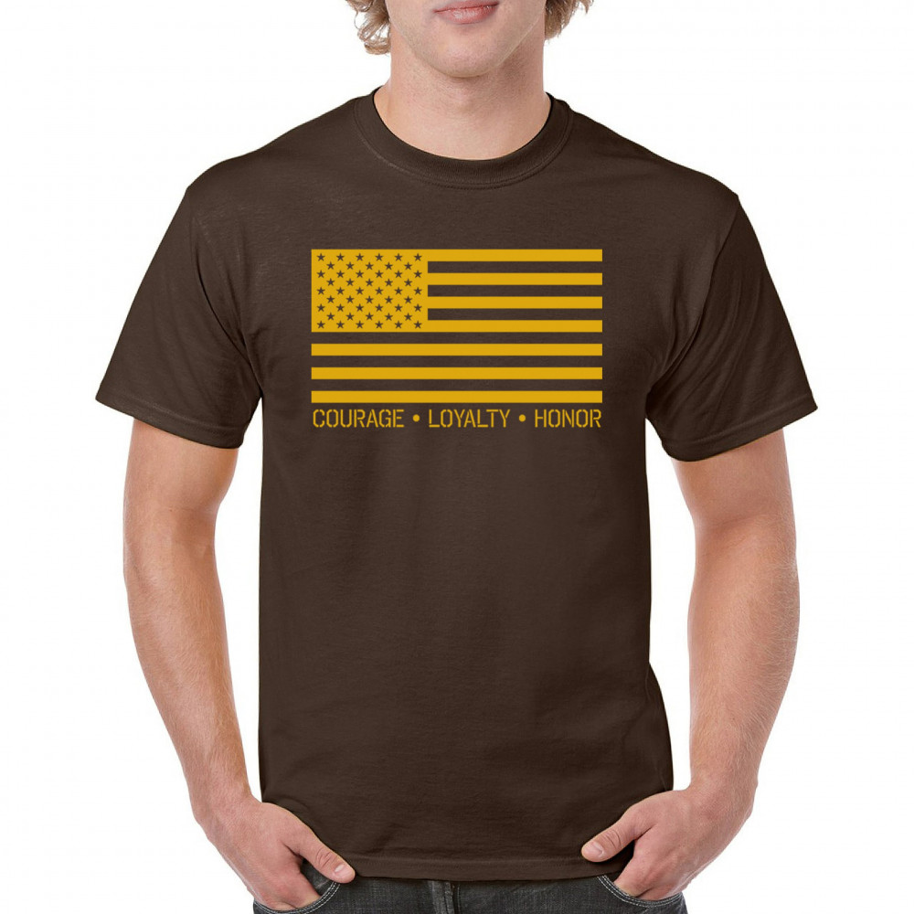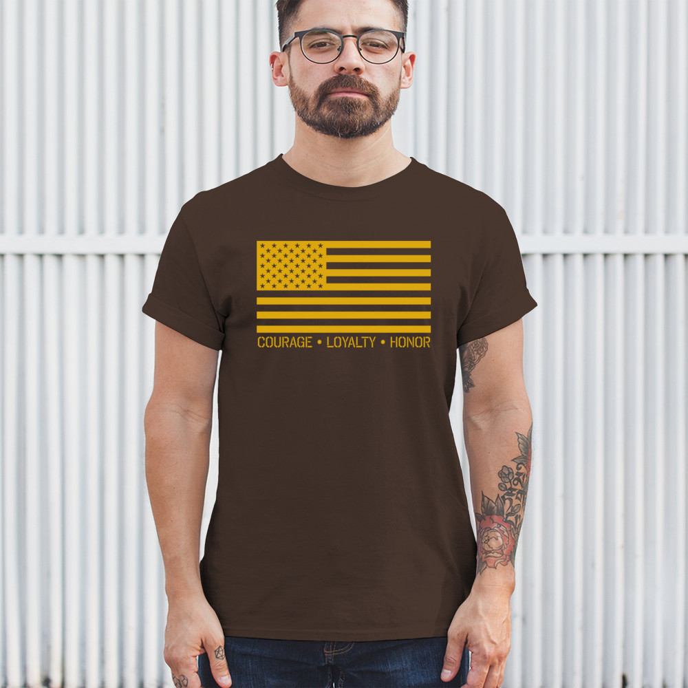 Honor the brave with our "Courage, Loyalty, Honor" USA flag shirt. Perfect for veterans and patriots. Ideal for Memorial Day and Veterans Day.