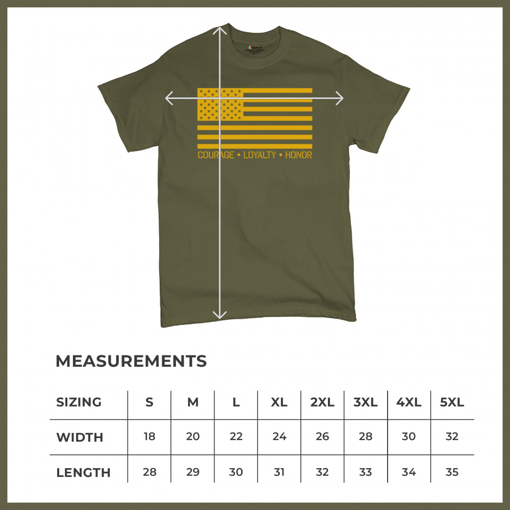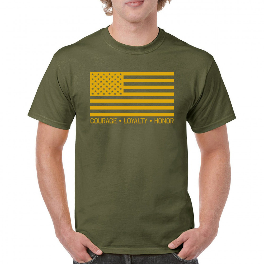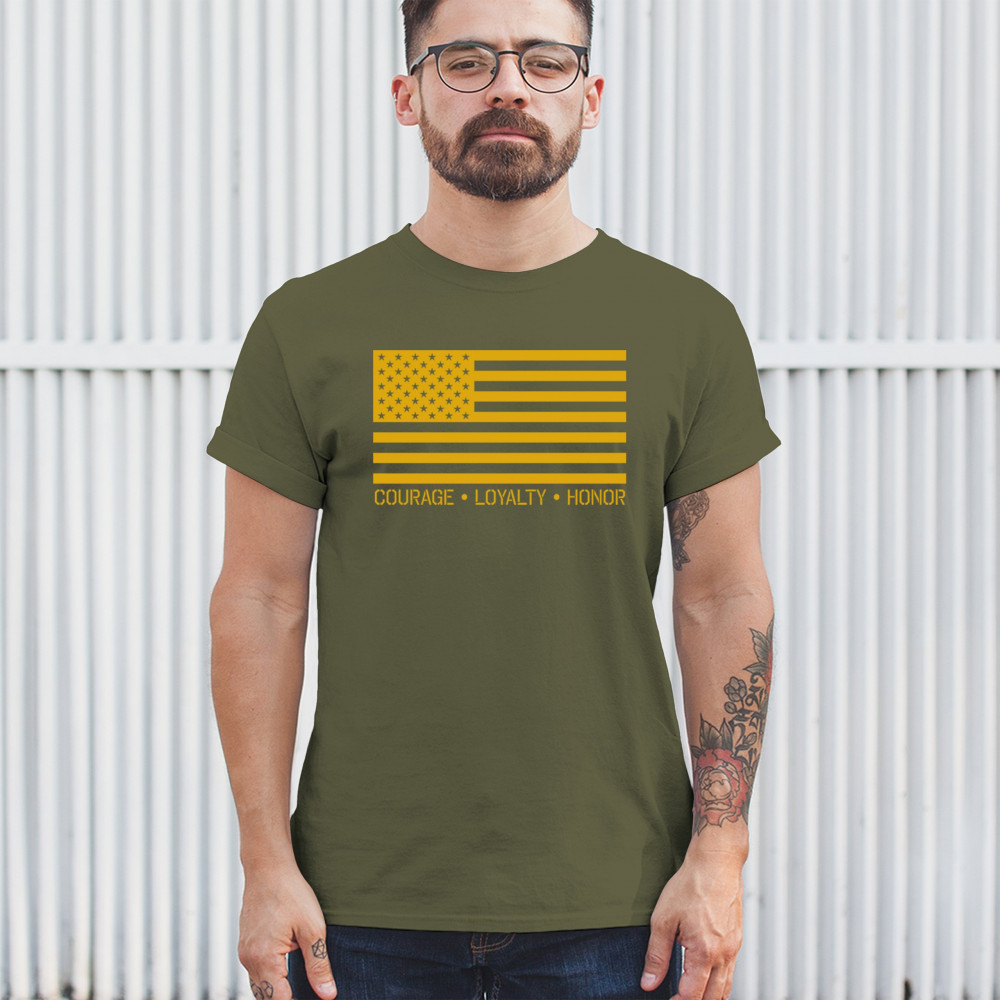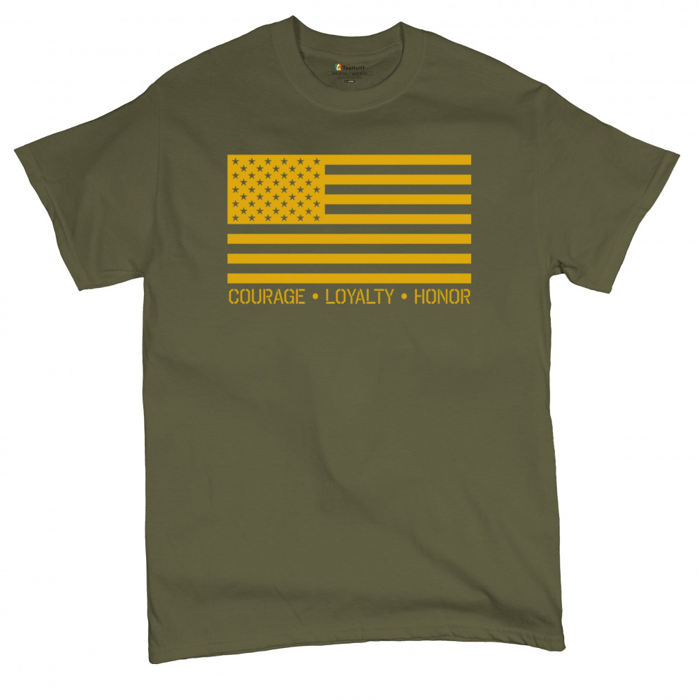 Honor the brave with our "Courage, Loyalty, Honor" USA flag shirt. Perfect for veterans and patriots. Ideal for Memorial Day and Veterans Day.