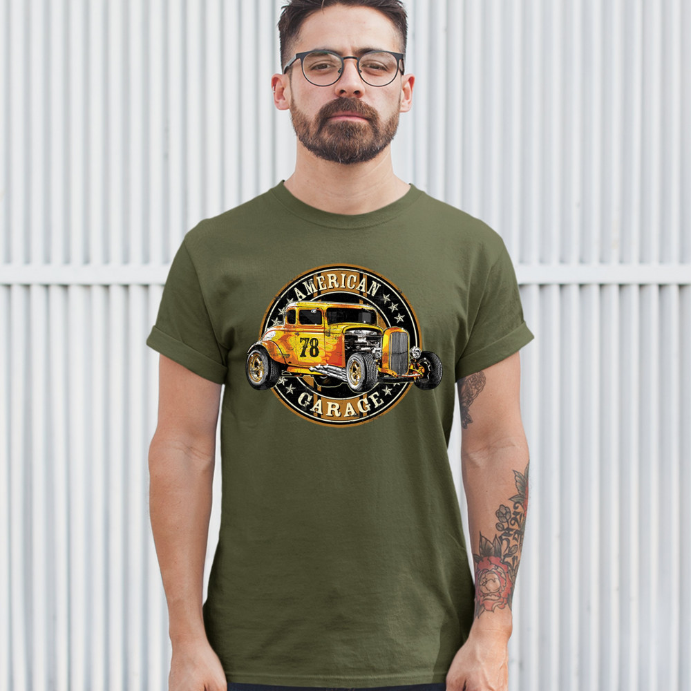 AMERICAN GARAGE t-shirt retro hot rod vintage american muscle men's tee military green