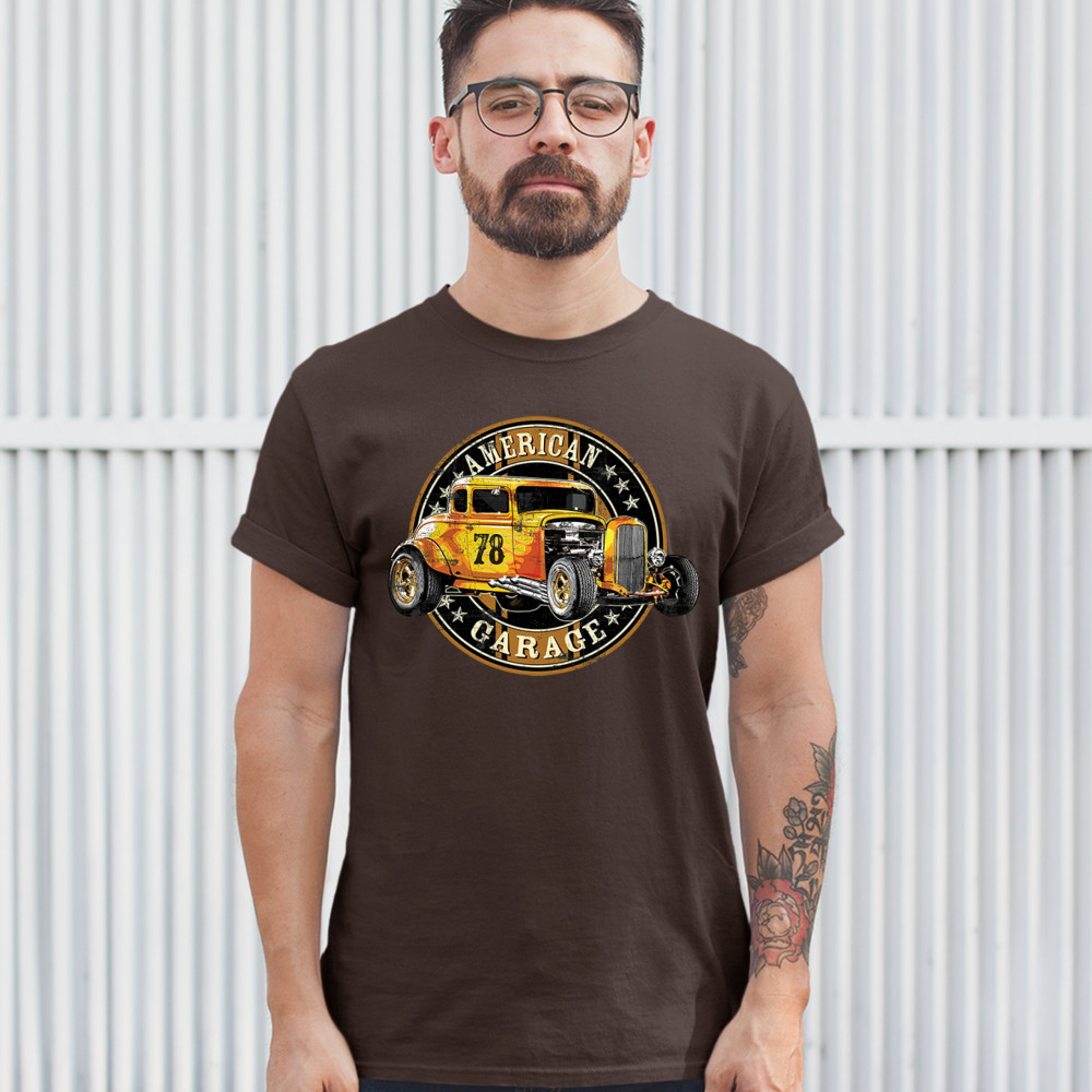 AMERICAN GARAGE t-shirt retro hot rod vintage american muscle men's tee brown