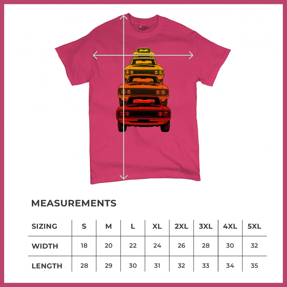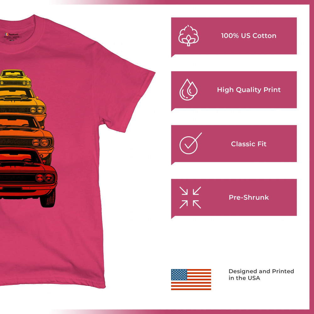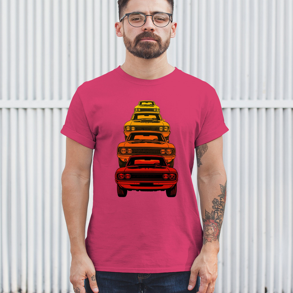 Celebrate horsepower heritage with this colorful lineup of classic muscle cars. Featuring a stacked gradient from red to yellow, this design brings bold retro attitude, V8 pride, and American torque to life. Perfect for collectors, gearheads, and fans of classic car power.