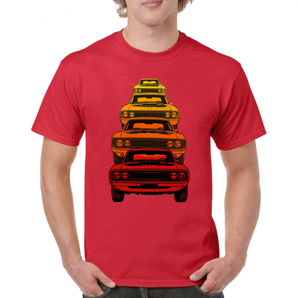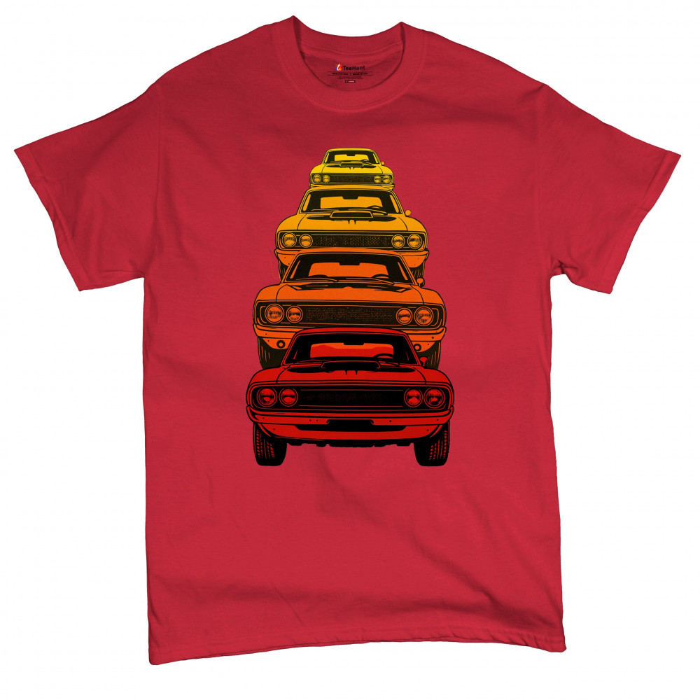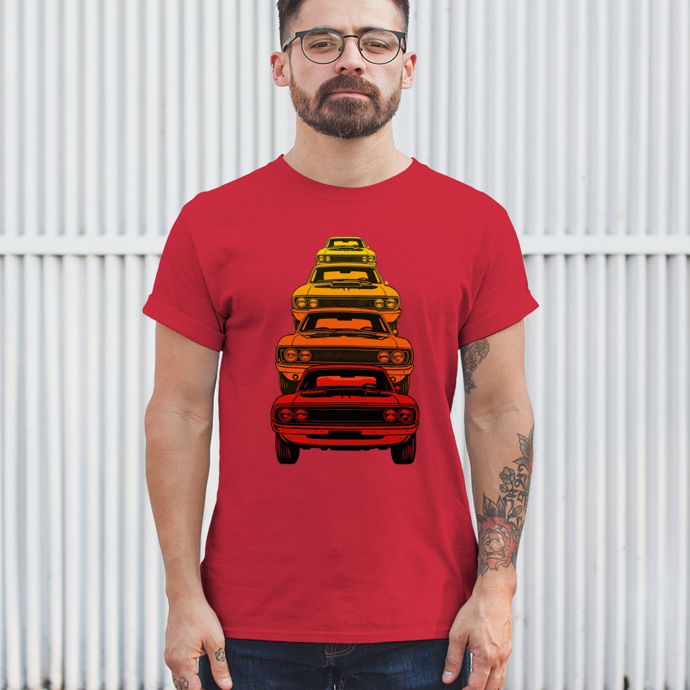 Celebrate horsepower heritage with this colorful lineup of classic muscle cars. Featuring a stacked gradient from red to yellow, this design brings bold retro attitude, V8 pride, and American torque to life. Perfect for collectors, gearheads, and fans of classic car power.