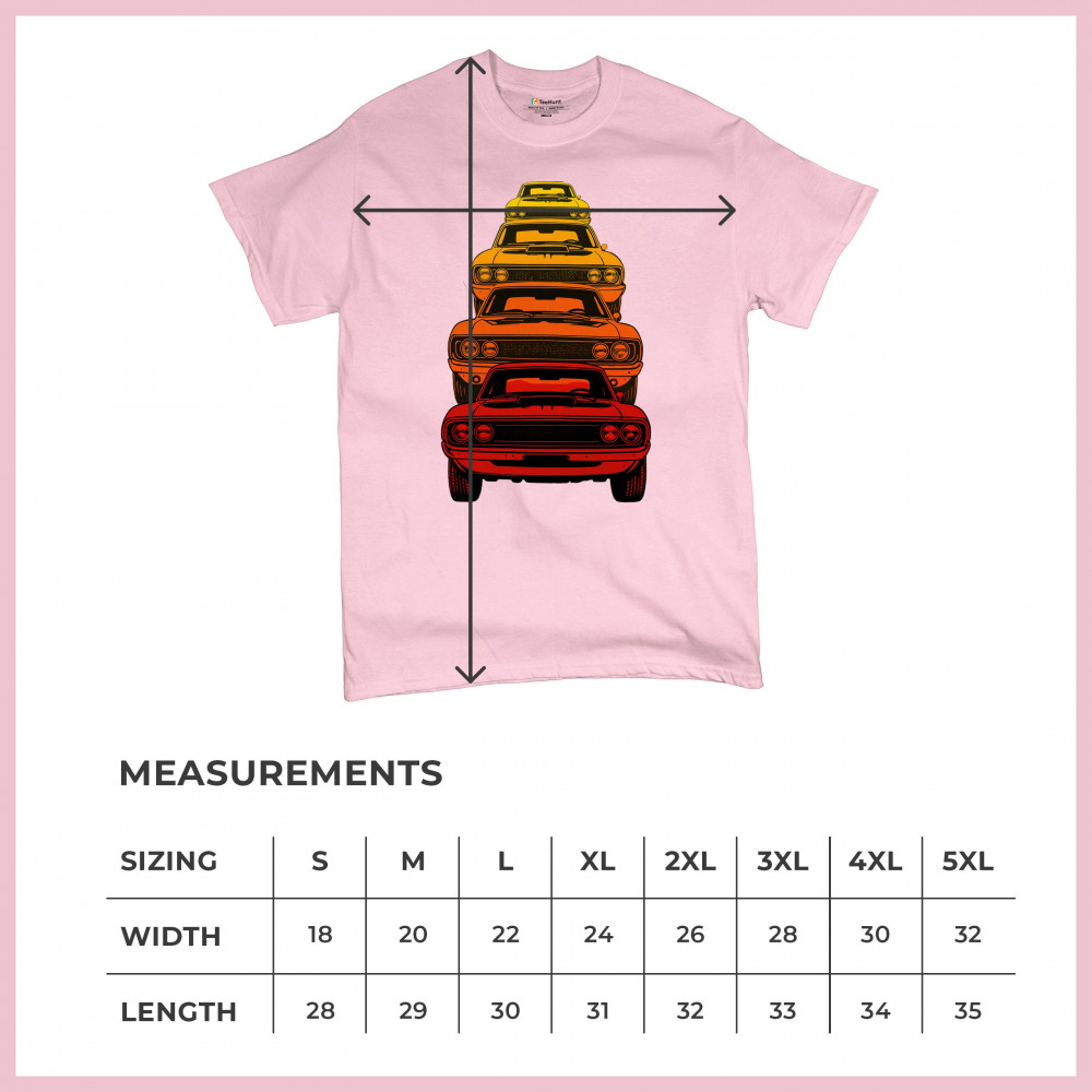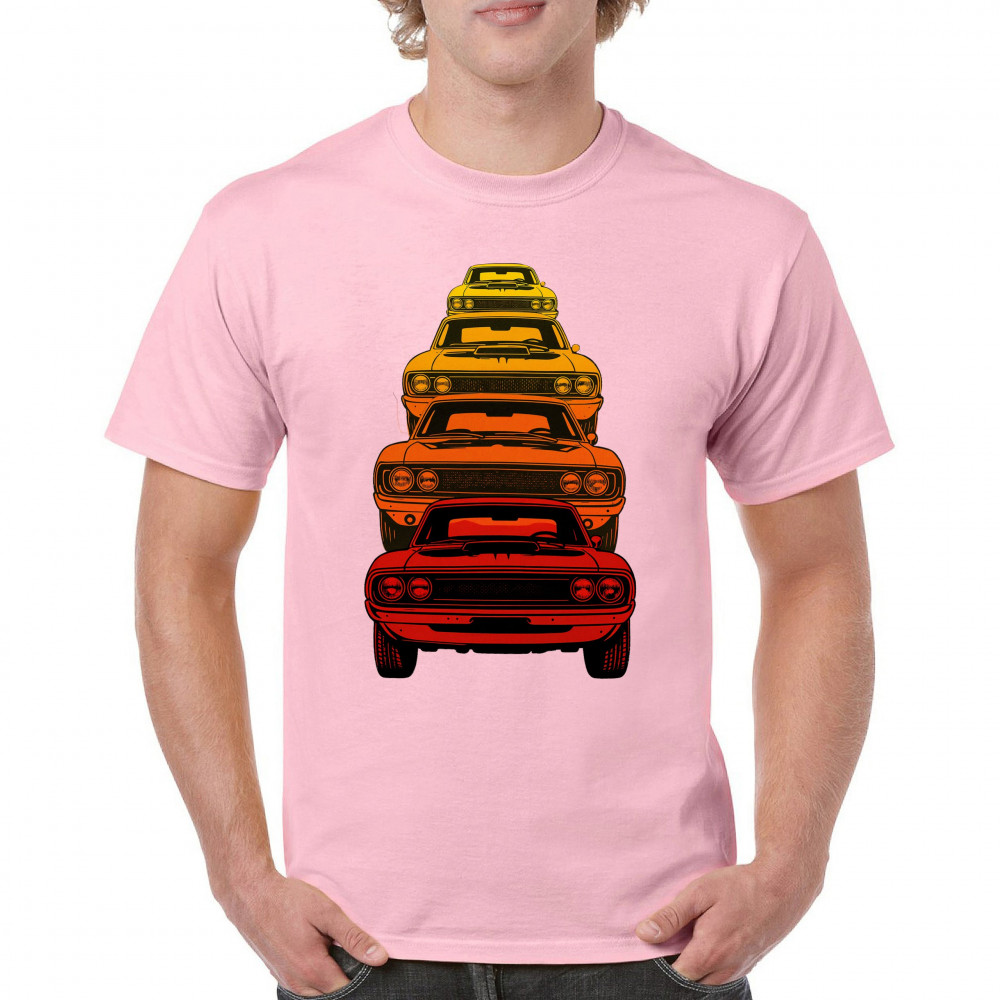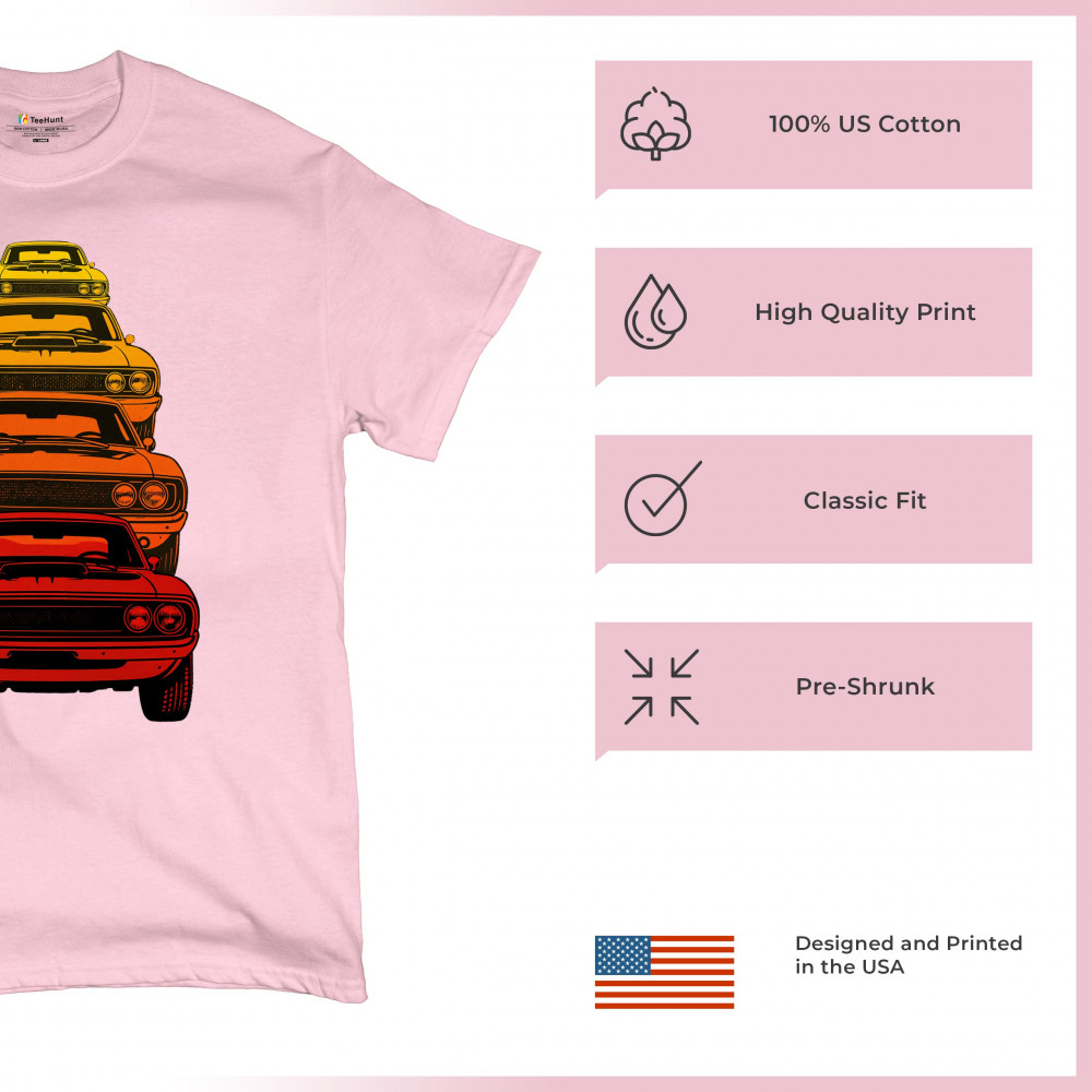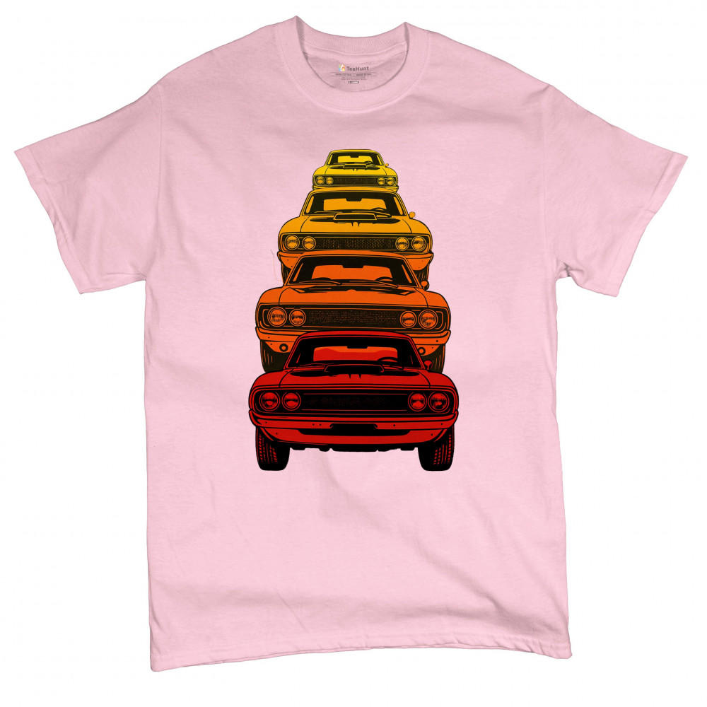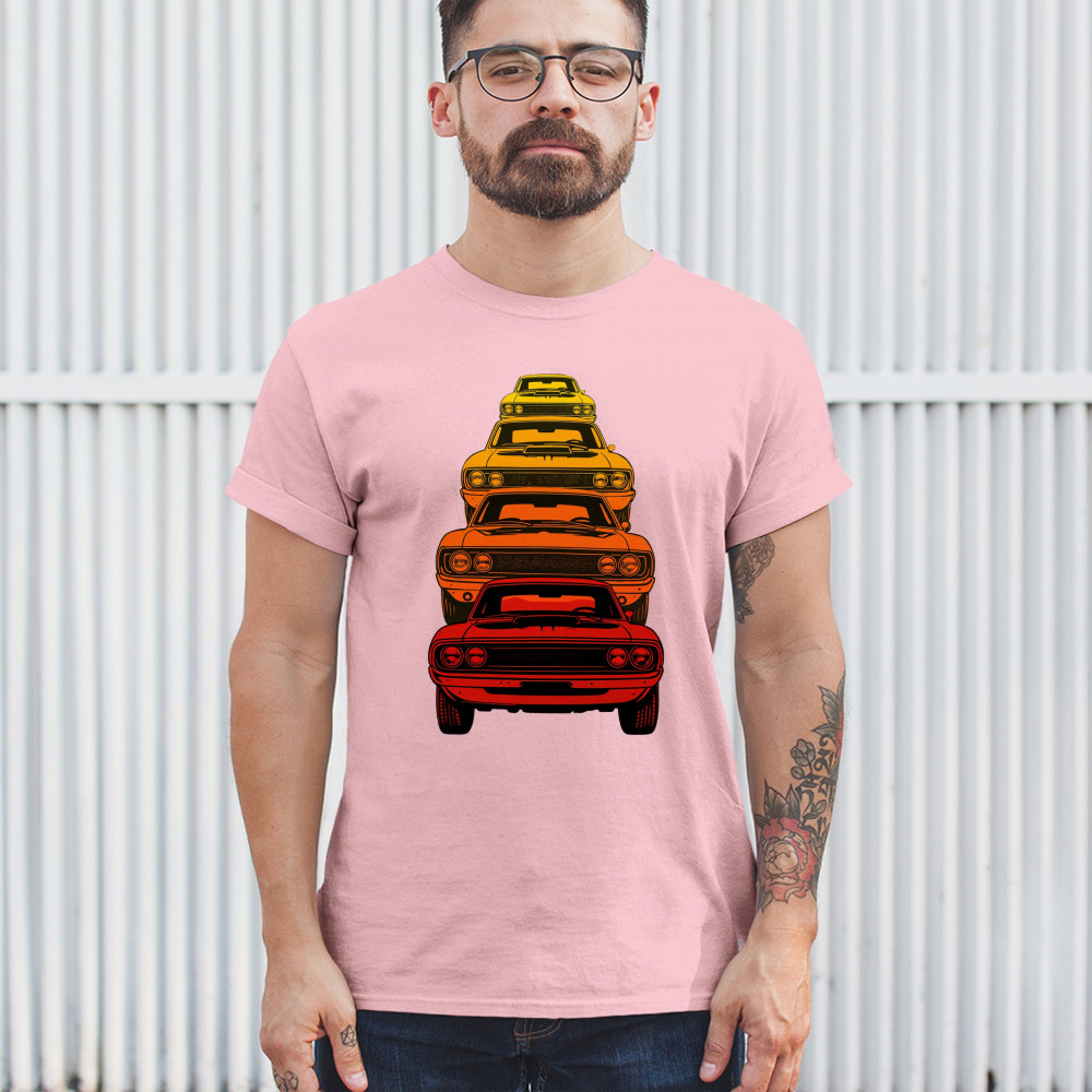 Celebrate horsepower heritage with this colorful lineup of classic muscle cars. Featuring a stacked gradient from red to yellow, this design brings bold retro attitude, V8 pride, and American torque to life. Perfect for collectors, gearheads, and fans of classic car power.