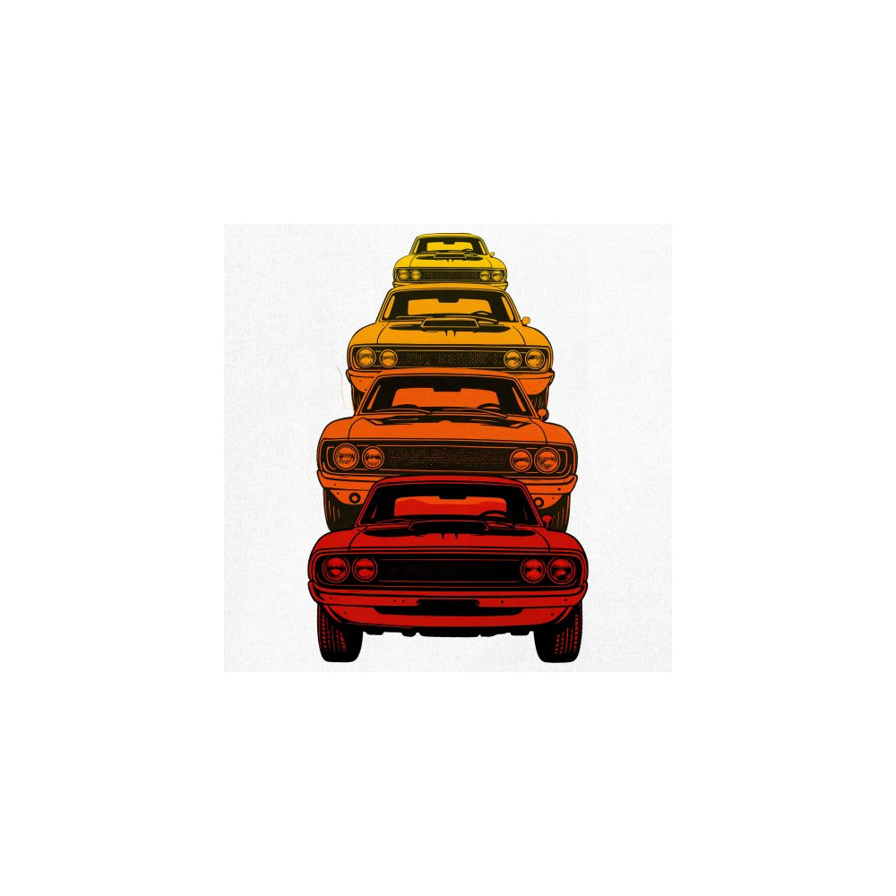 Celebrate horsepower heritage with this colorful lineup of classic muscle cars. Featuring a stacked gradient from red to yellow, this design brings bold retro attitude, V8 pride, and American torque to life. Perfect for collectors, gearheads, and fans of classic car power.