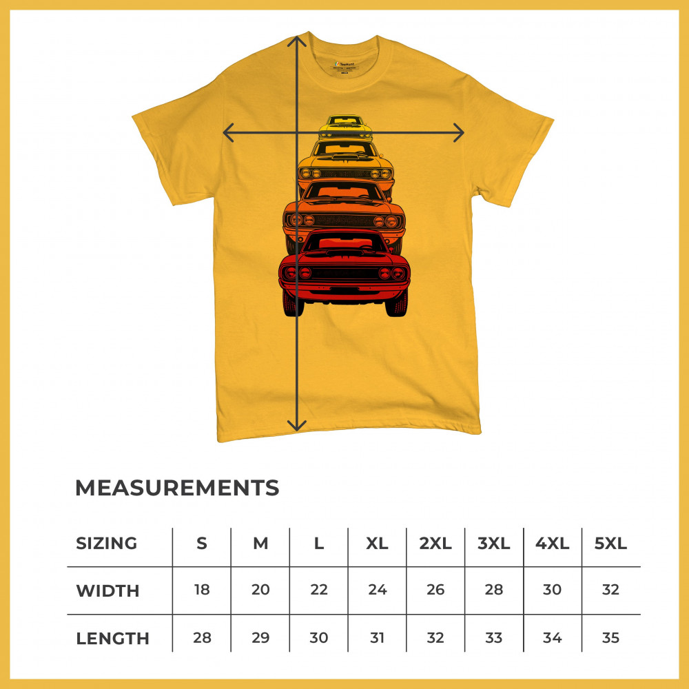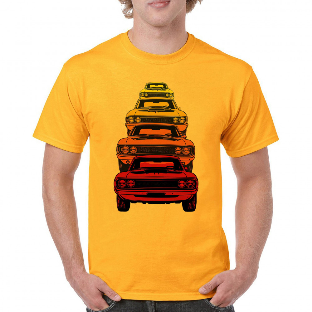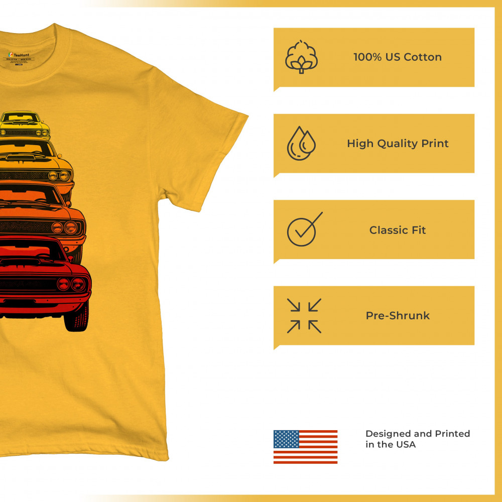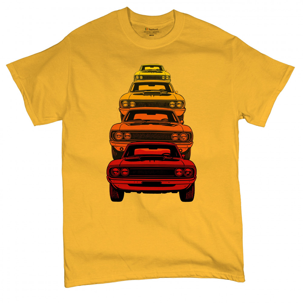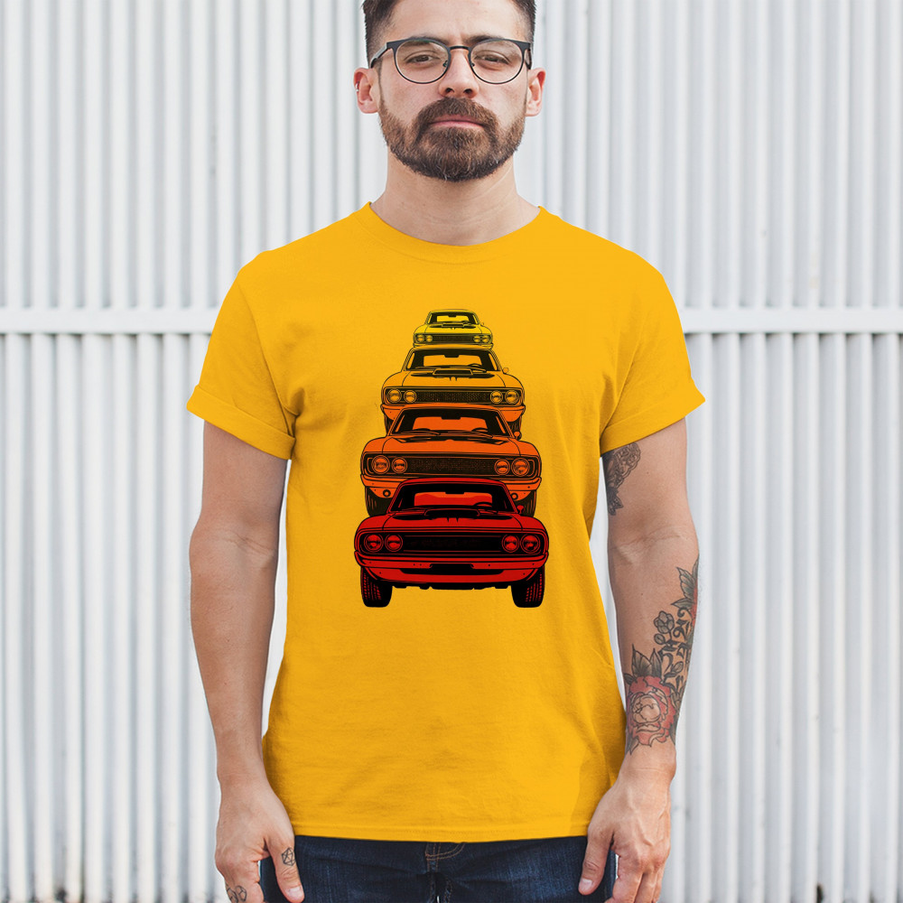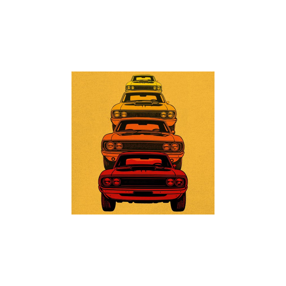 Celebrate horsepower heritage with this colorful lineup of classic muscle cars. Featuring a stacked gradient from red to yellow, this design brings bold retro attitude, V8 pride, and American torque to life. Perfect for collectors, gearheads, and fans of classic car power.