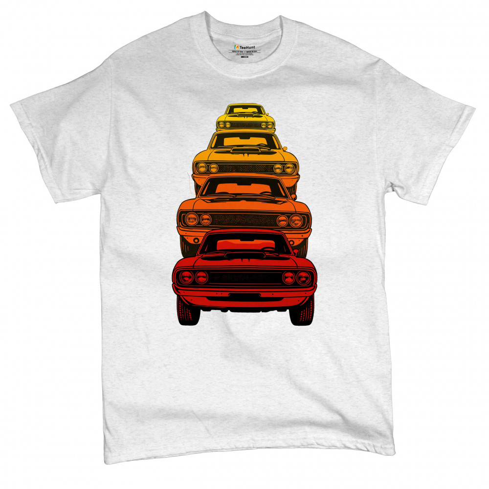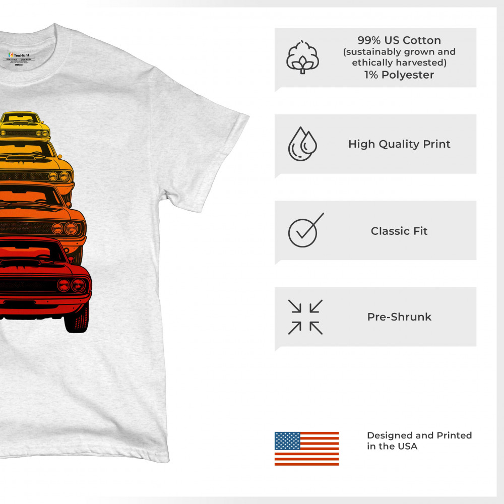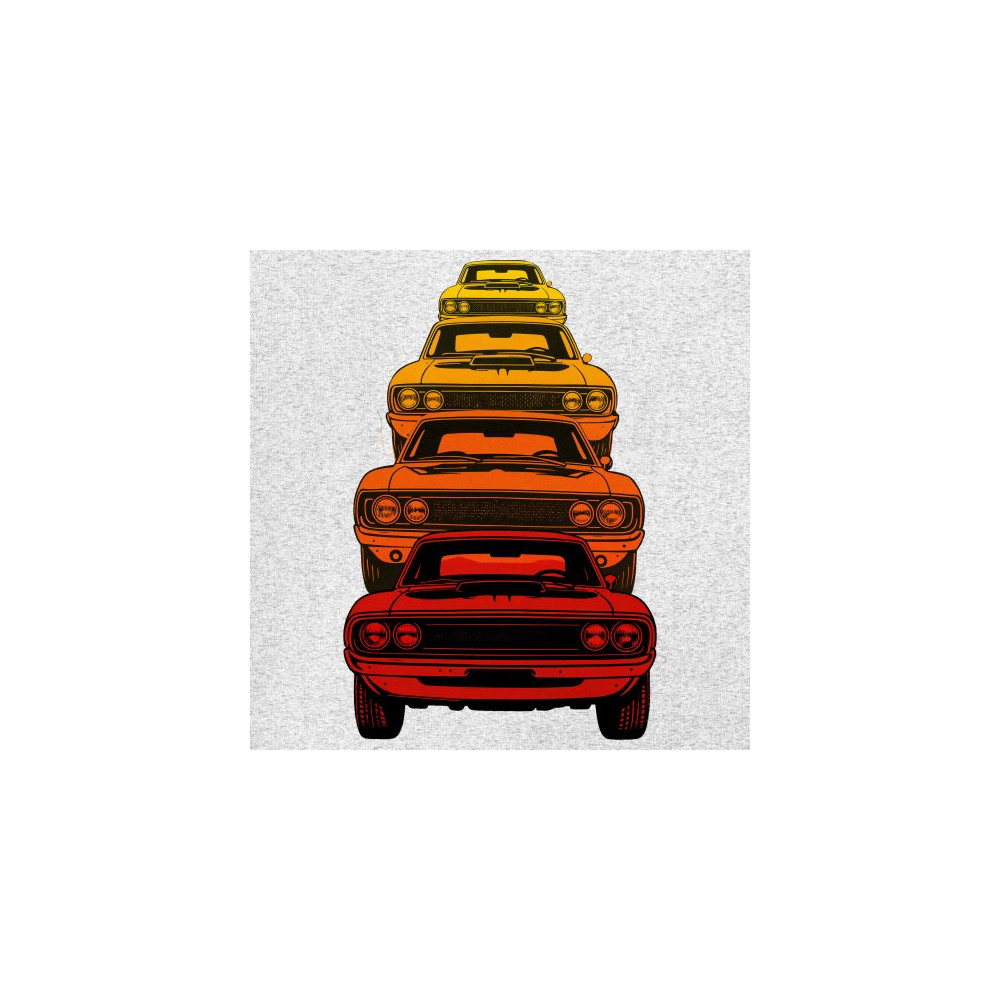 Celebrate horsepower heritage with this colorful lineup of classic muscle cars. Featuring a stacked gradient from red to yellow, this design brings bold retro attitude, V8 pride, and American torque to life. Perfect for collectors, gearheads, and fans of classic car power.