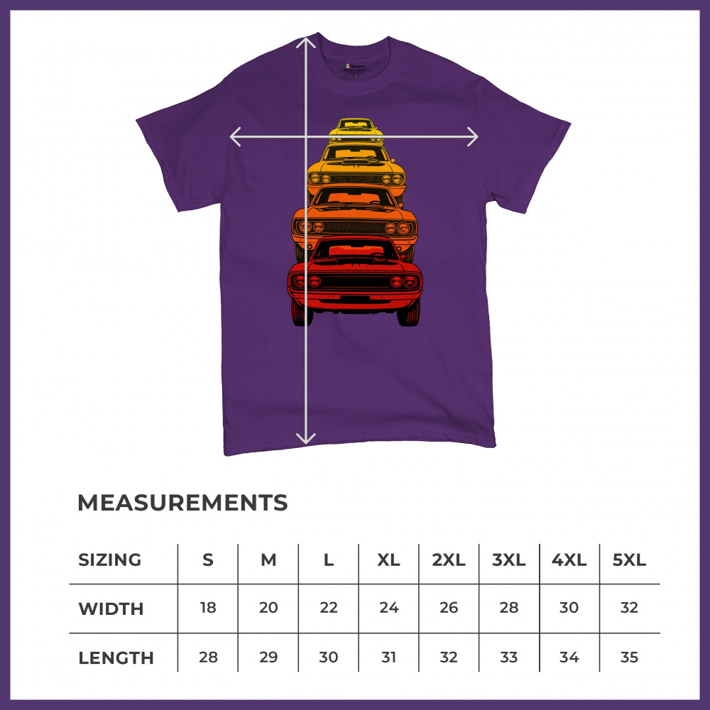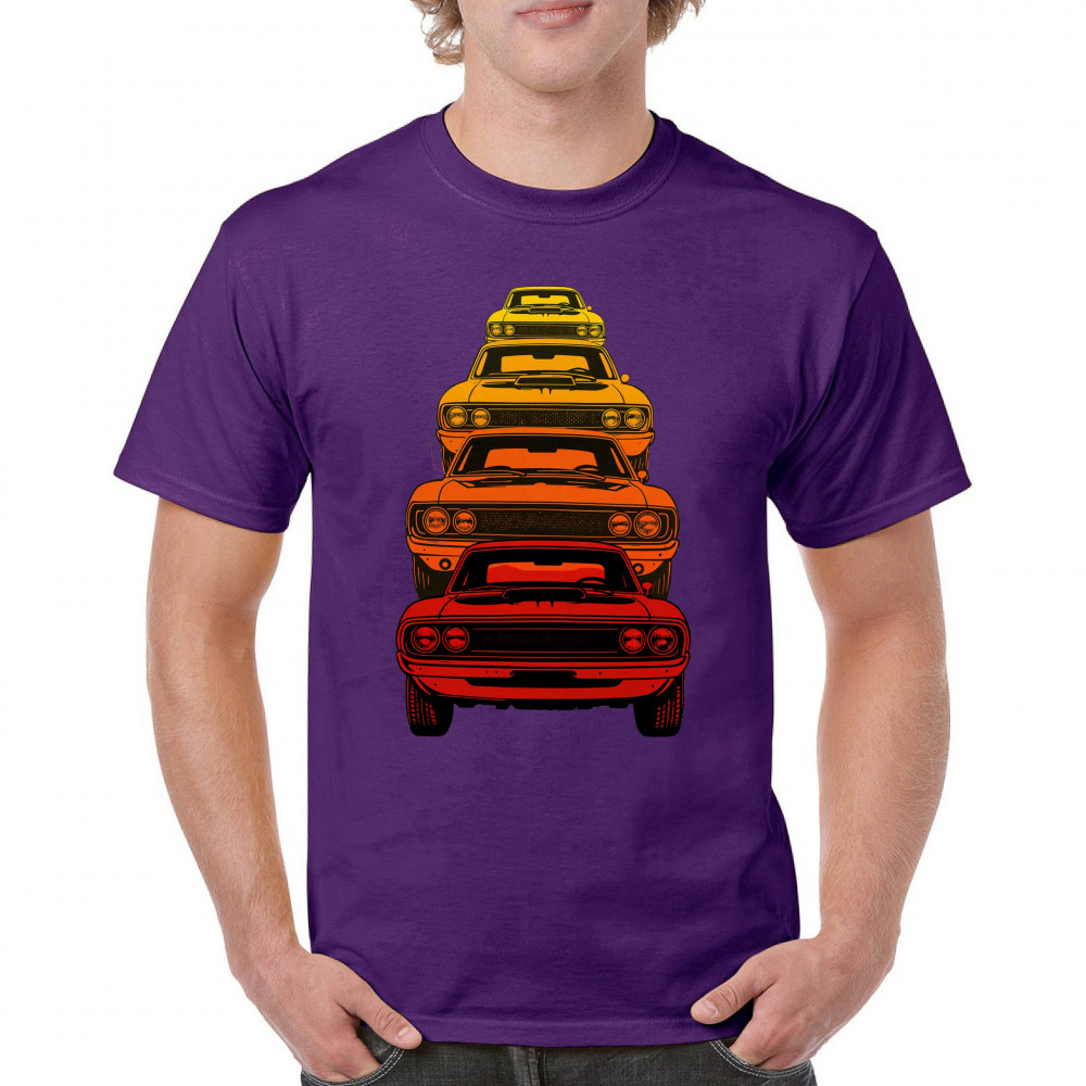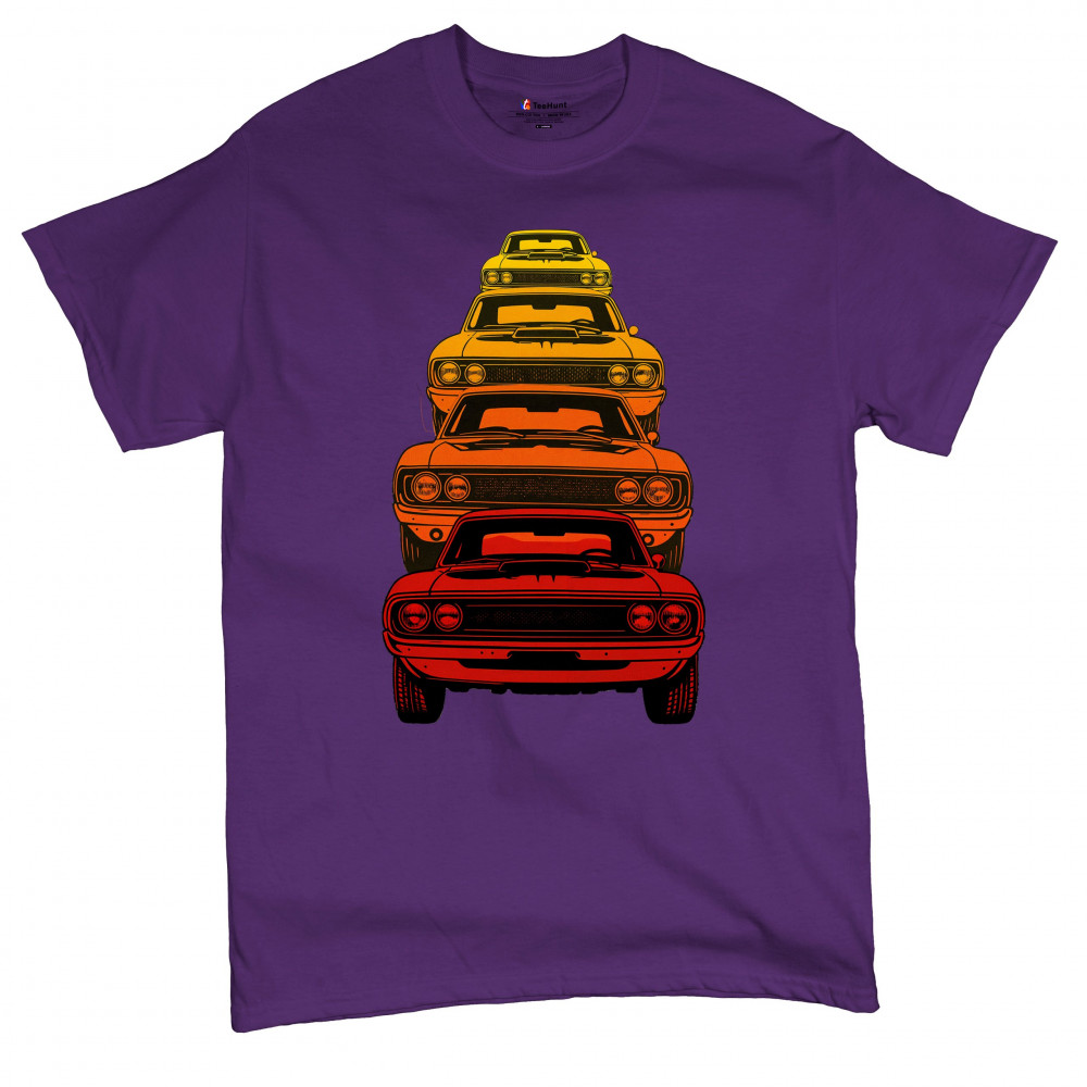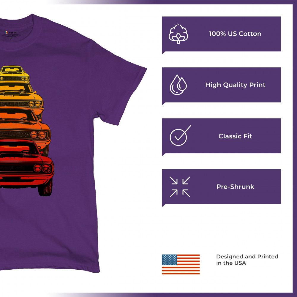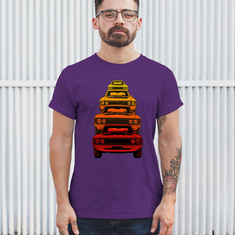 Celebrate horsepower heritage with this colorful lineup of classic muscle cars. Featuring a stacked gradient from red to yellow, this design brings bold retro attitude, V8 pride, and American torque to life. Perfect for collectors, gearheads, and fans of classic car power.
