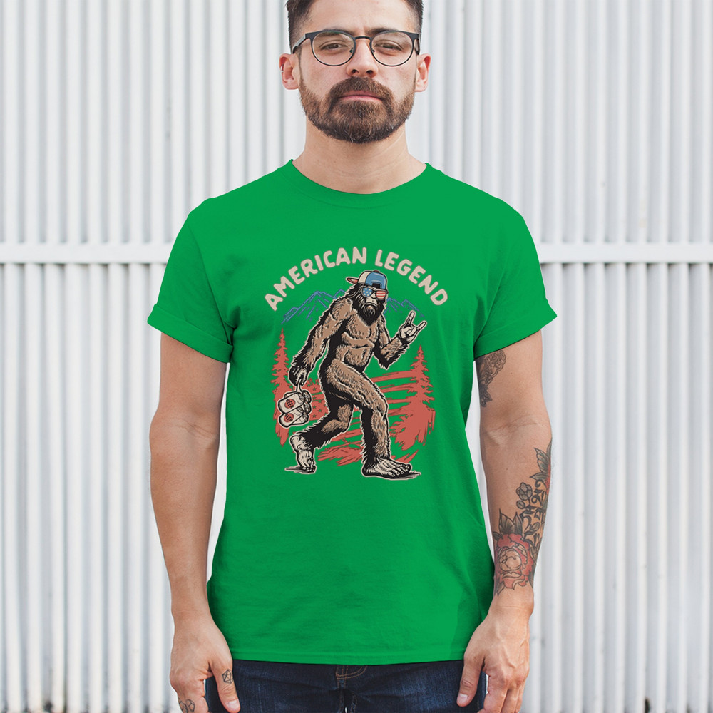 Funny Bigfoot design with patriotic flair—ideal for BBQs, beer lovers, campers, and cryptid fans who love to party in style!