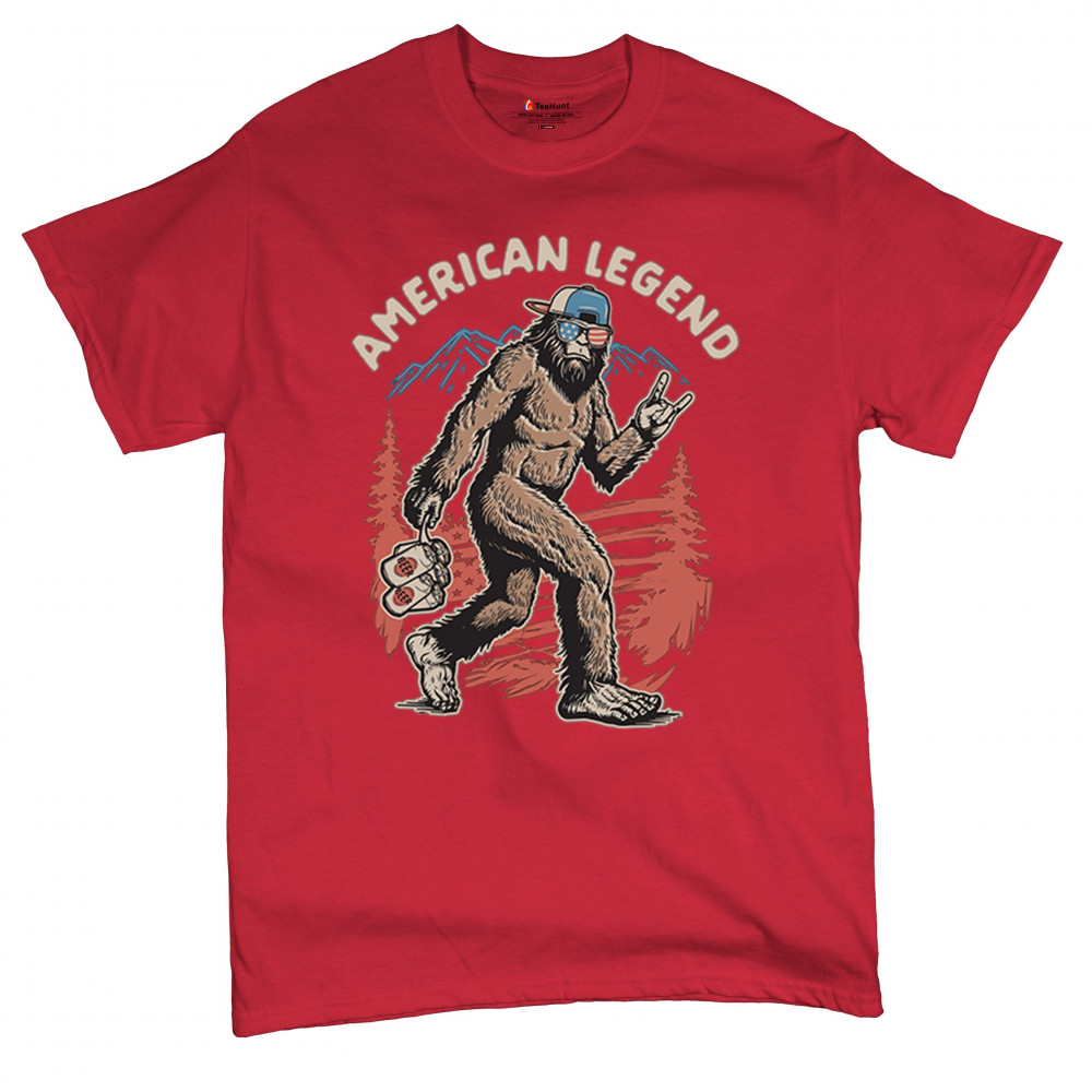 Funny Bigfoot design with patriotic flair—ideal for BBQs, beer lovers, campers, and cryptid fans who love to party in style!