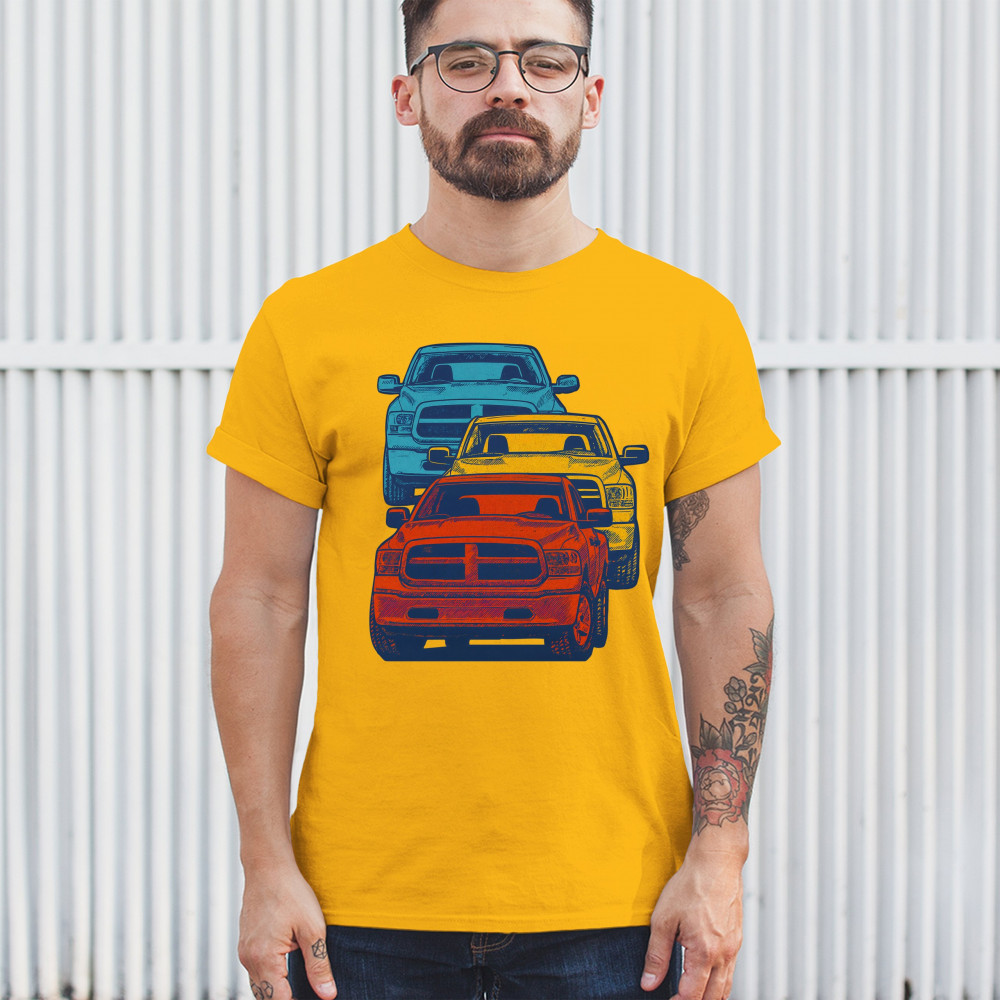 Boldly stacked and powerfully styled, this multicolor truck design showcases red, yellow, and blue pickups in a vertical formation. Made for fans of lifted truck culture, horsepower, and off-road pride, it celebrates diesel grit, road attitude, and the spirit of truck meets and gearhead unity.