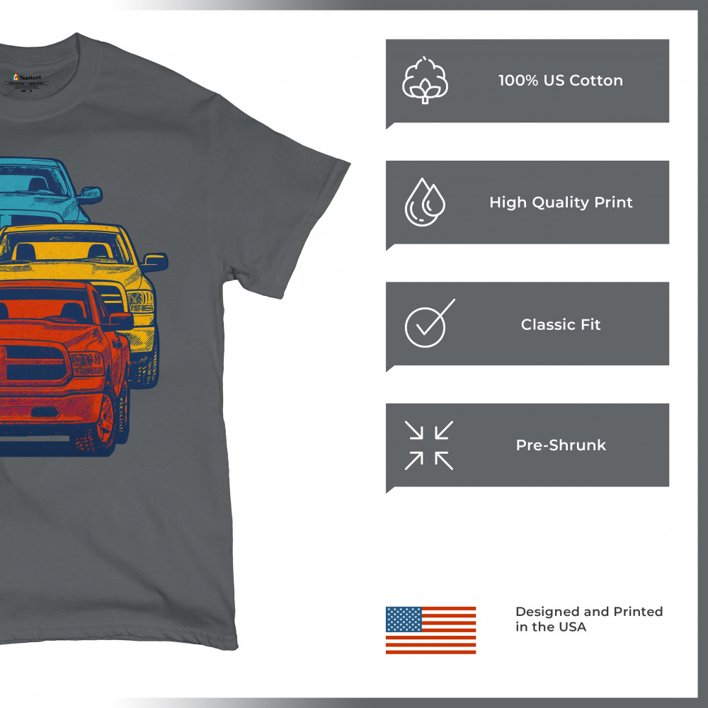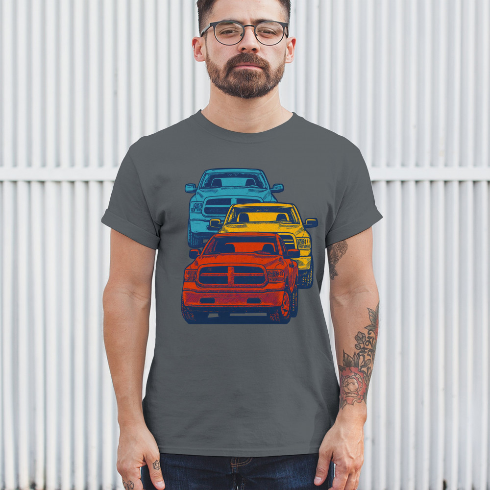 Boldly stacked and powerfully styled, this multicolor truck design showcases red, yellow, and blue pickups in a vertical formation. Made for fans of lifted truck culture, horsepower, and off-road pride, it celebrates diesel grit, road attitude, and the spirit of truck meets and gearhead unity.