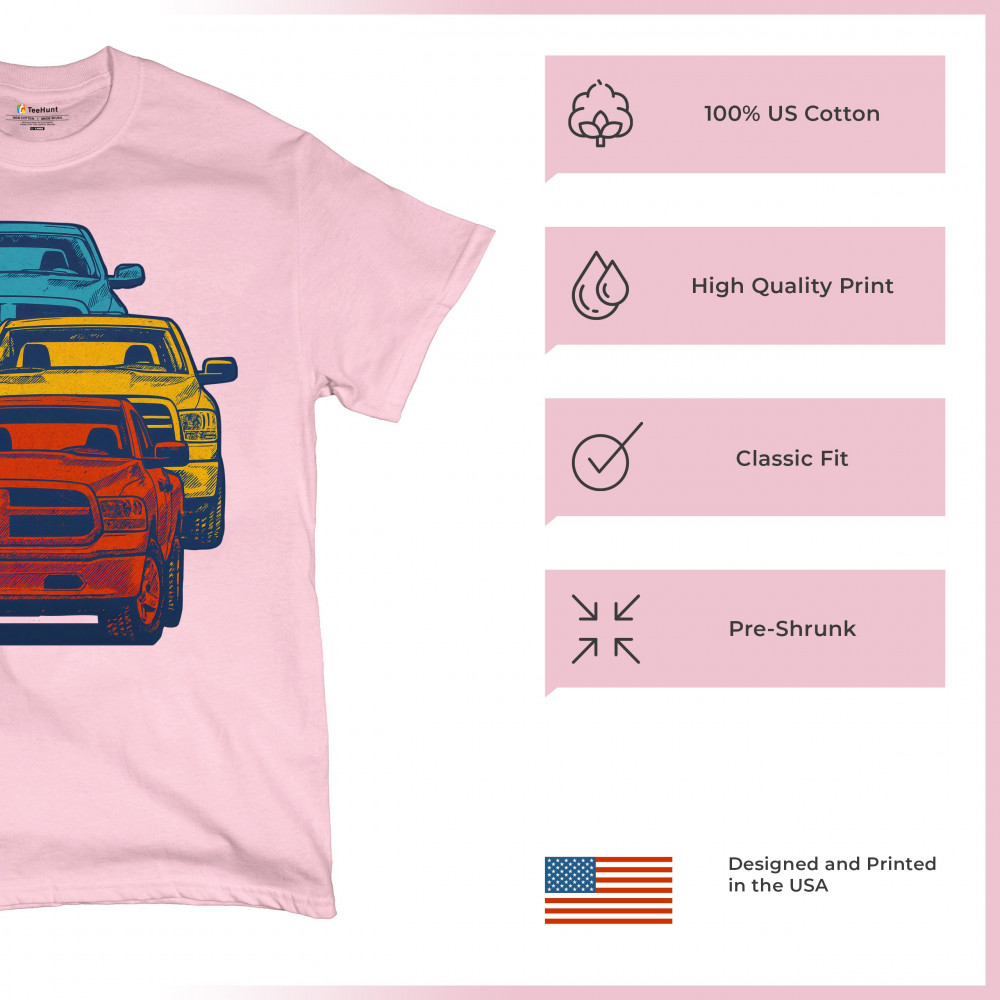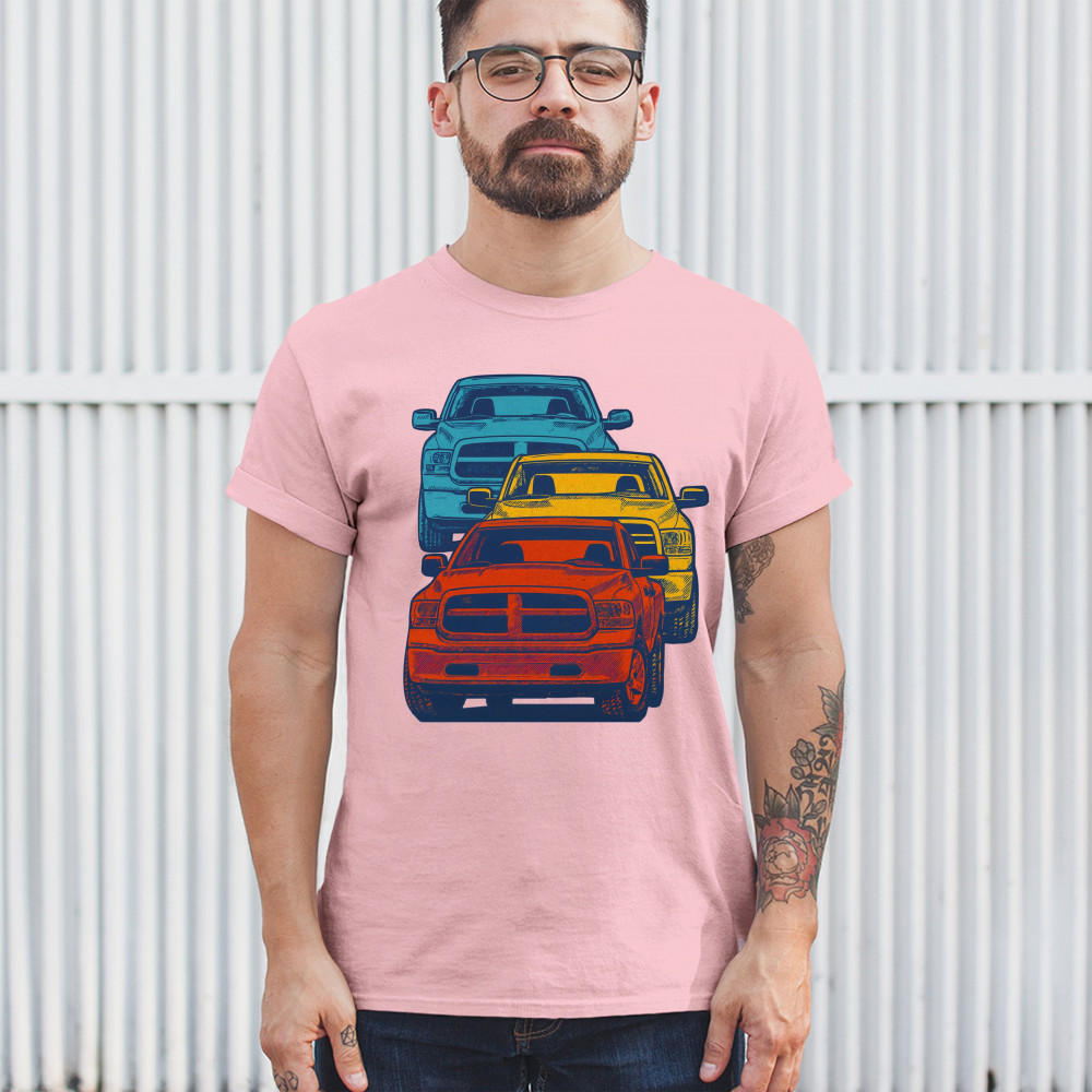 Boldly stacked and powerfully styled, this multicolor truck design showcases red, yellow, and blue pickups in a vertical formation. Made for fans of lifted truck culture, horsepower, and off-road pride, it celebrates diesel grit, road attitude, and the spirit of truck meets and gearhead unity.