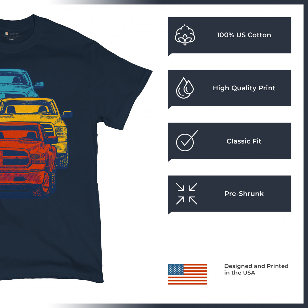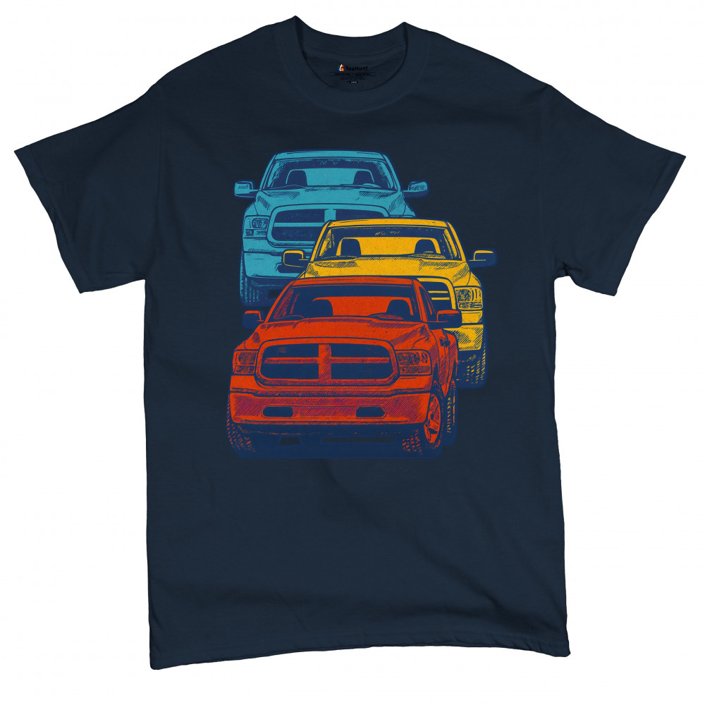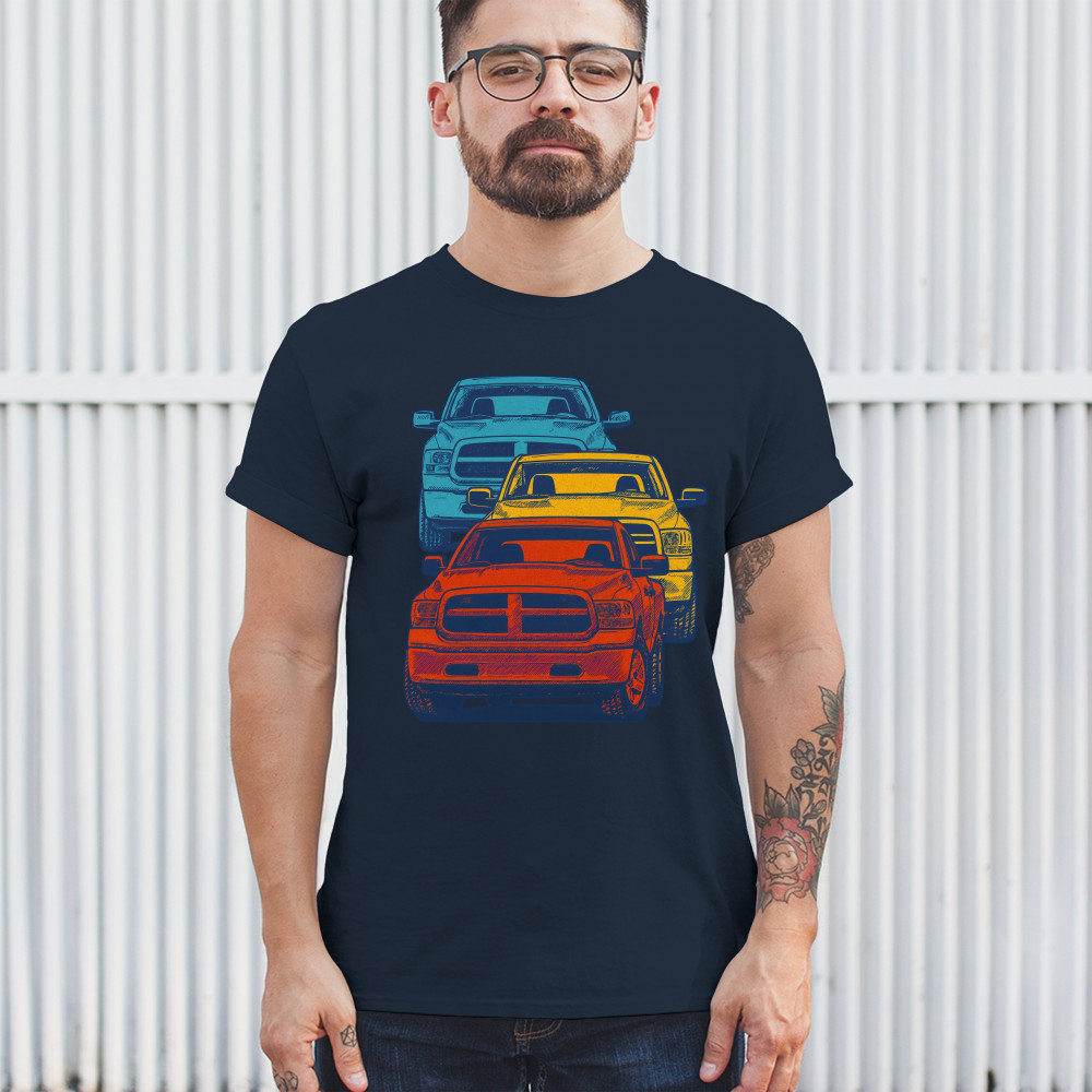 Boldly stacked and powerfully styled, this multicolor truck design showcases red, yellow, and blue pickups in a vertical formation. Made for fans of lifted truck culture, horsepower, and off-road pride, it celebrates diesel grit, road attitude, and the spirit of truck meets and gearhead unity.