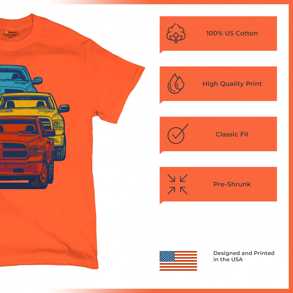 Boldly stacked and powerfully styled, this multicolor truck design showcases red, yellow, and blue pickups in a vertical formation. Made for fans of lifted truck culture, horsepower, and off-road pride, it celebrates diesel grit, road attitude, and the spirit of truck meets and gearhead unity.