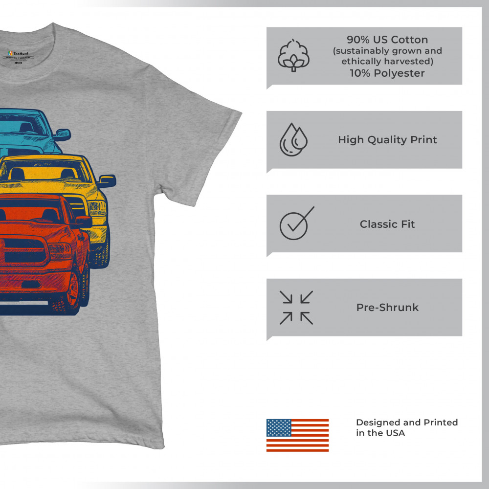 Boldly stacked and powerfully styled, this multicolor truck design showcases red, yellow, and blue pickups in a vertical formation. Made for fans of lifted truck culture, horsepower, and off-road pride, it celebrates diesel grit, road attitude, and the spirit of truck meets and gearhead unity.