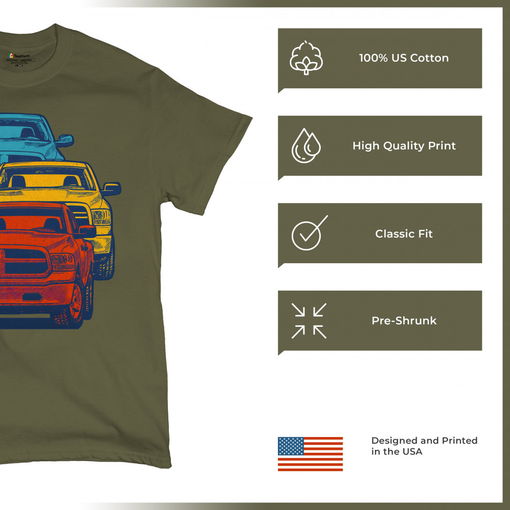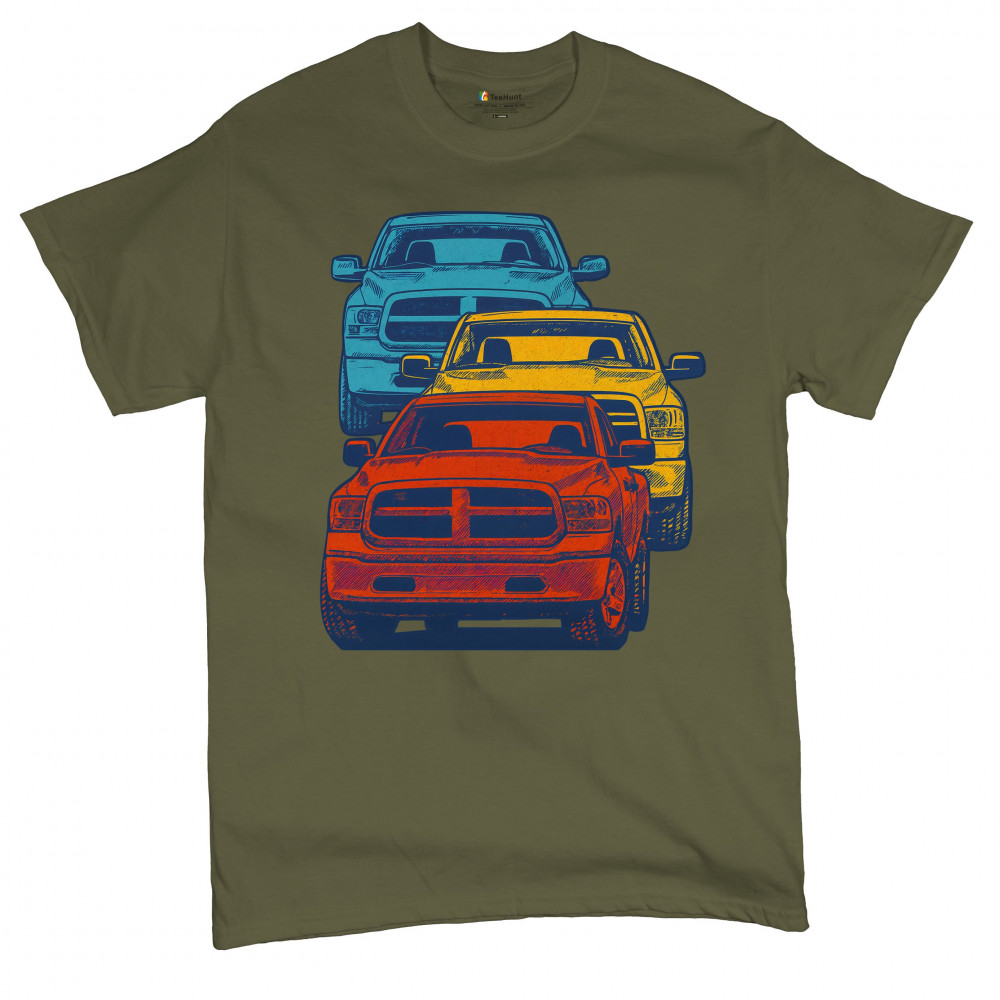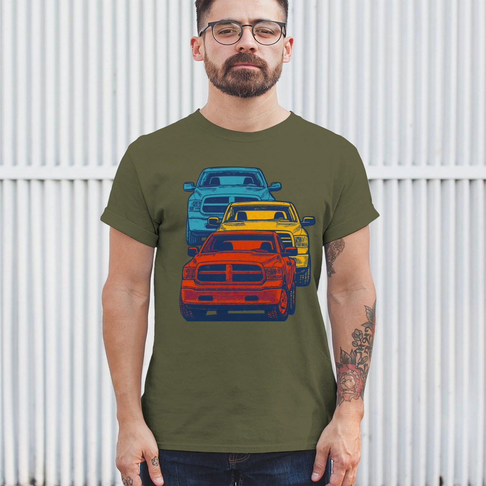 Boldly stacked and powerfully styled, this multicolor truck design showcases red, yellow, and blue pickups in a vertical formation. Made for fans of lifted truck culture, horsepower, and off-road pride, it celebrates diesel grit, road attitude, and the spirit of truck meets and gearhead unity.