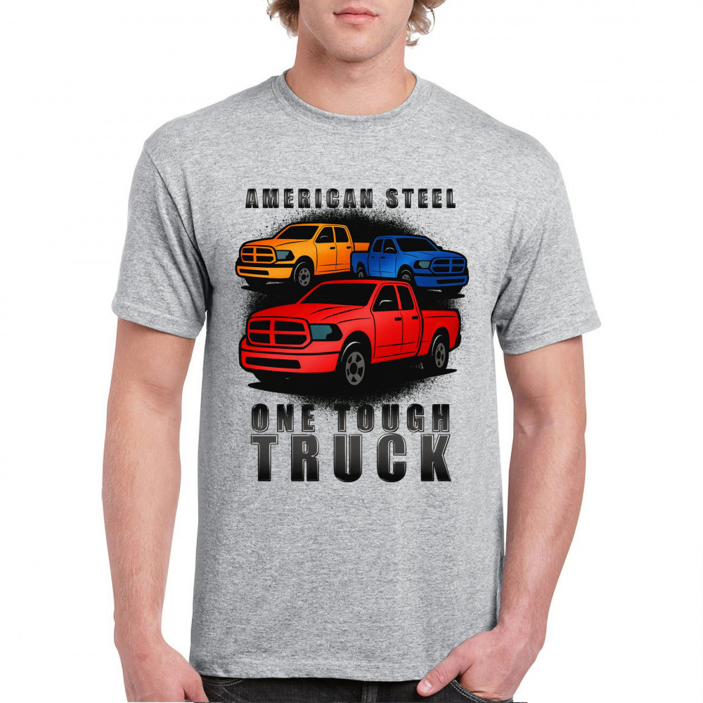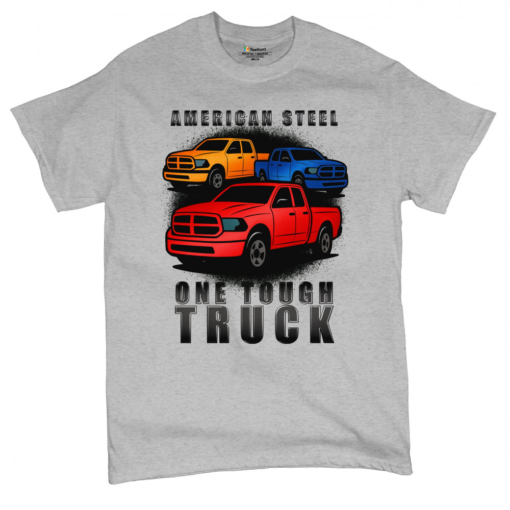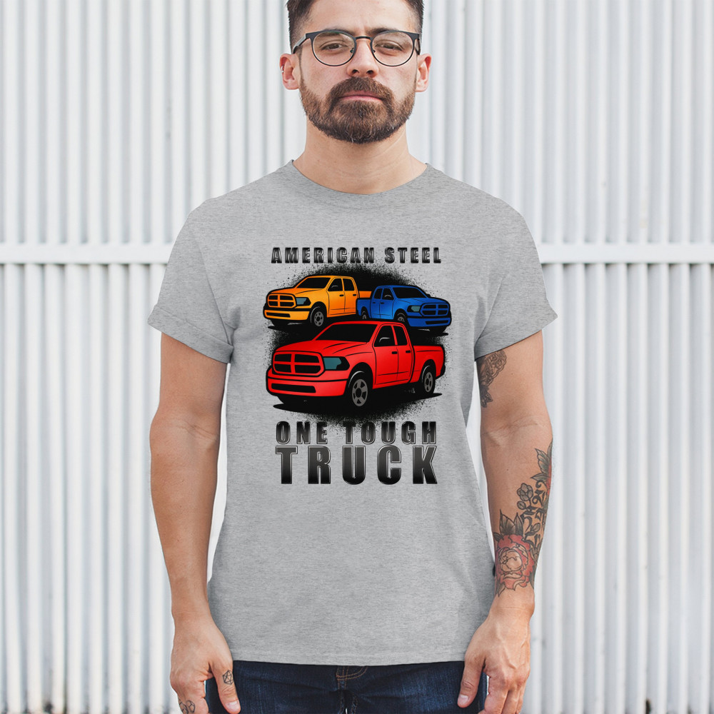 Bold truck design with red, yellow, and blue pickups. Built for fans of American steel, tough performance, and road warrior pride.