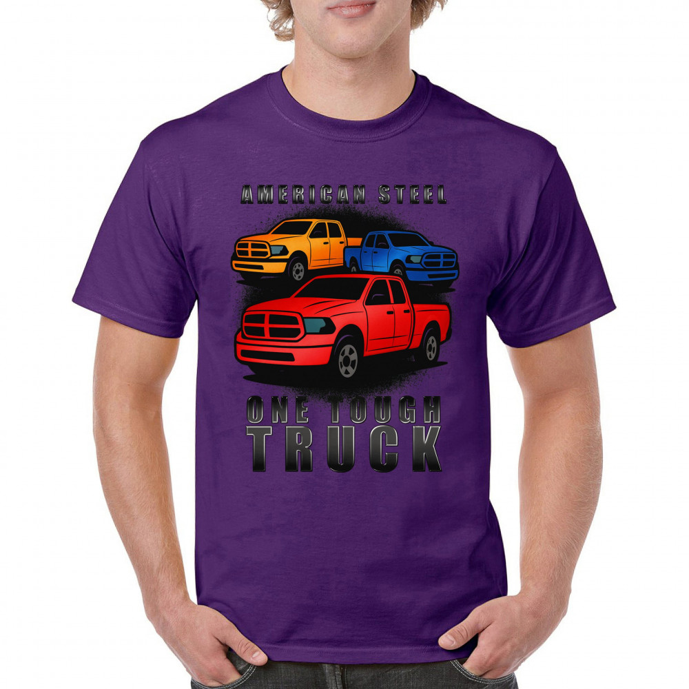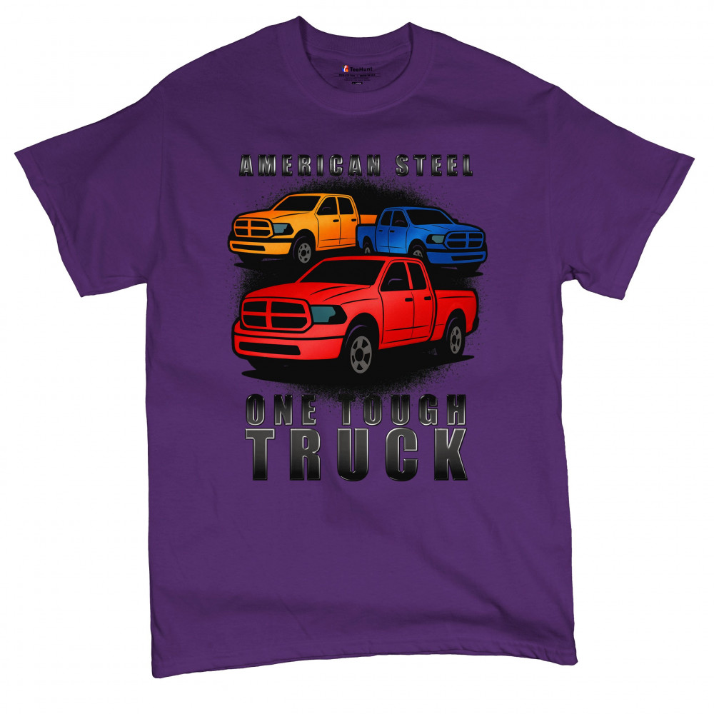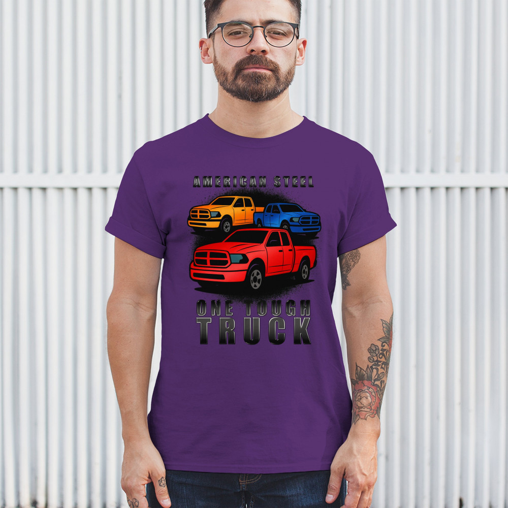 Bold truck design with red, yellow, and blue pickups. Built for fans of American steel, tough performance, and road warrior pride.