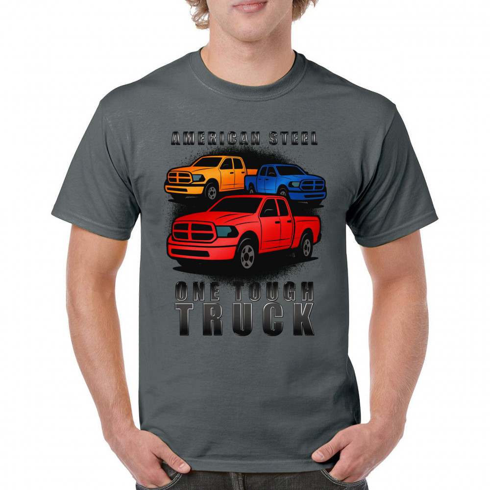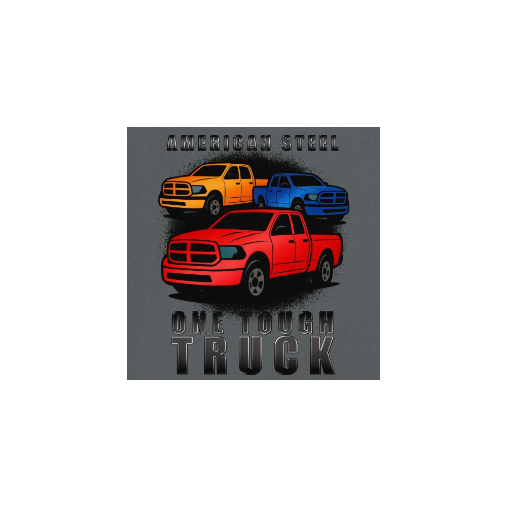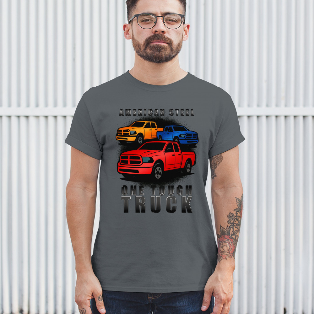Bold truck design with red, yellow, and blue pickups. Built for fans of American steel, tough performance, and road warrior pride.