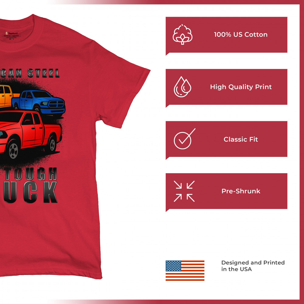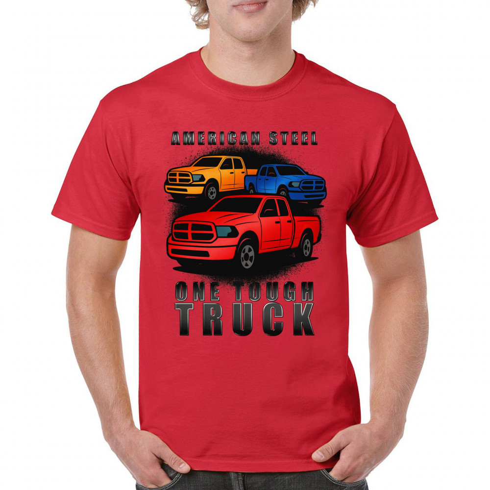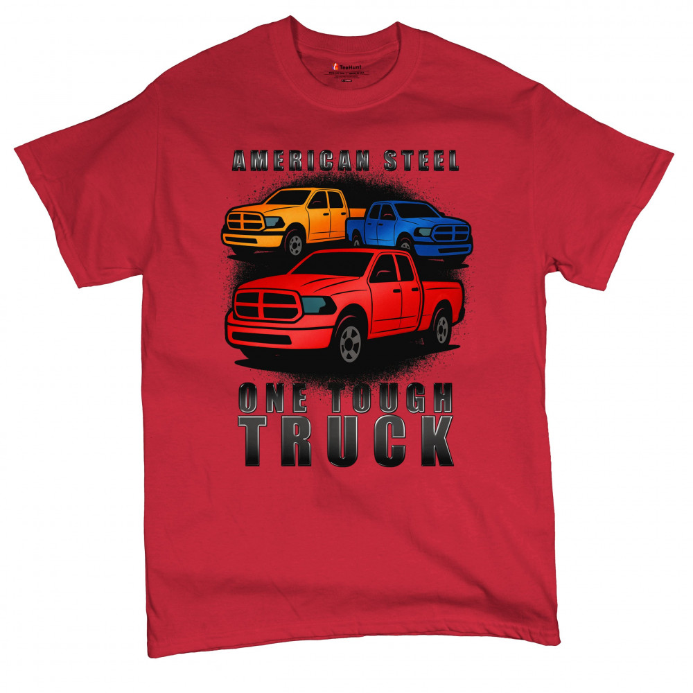 Bold truck design with red, yellow, and blue pickups. Built for fans of American steel, tough performance, and road warrior pride.