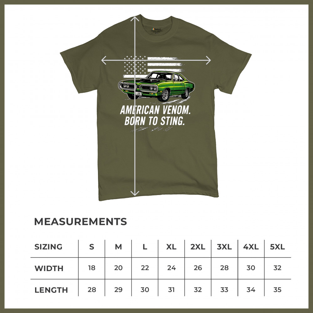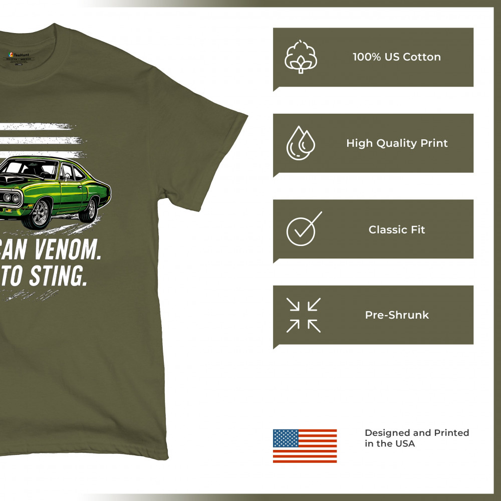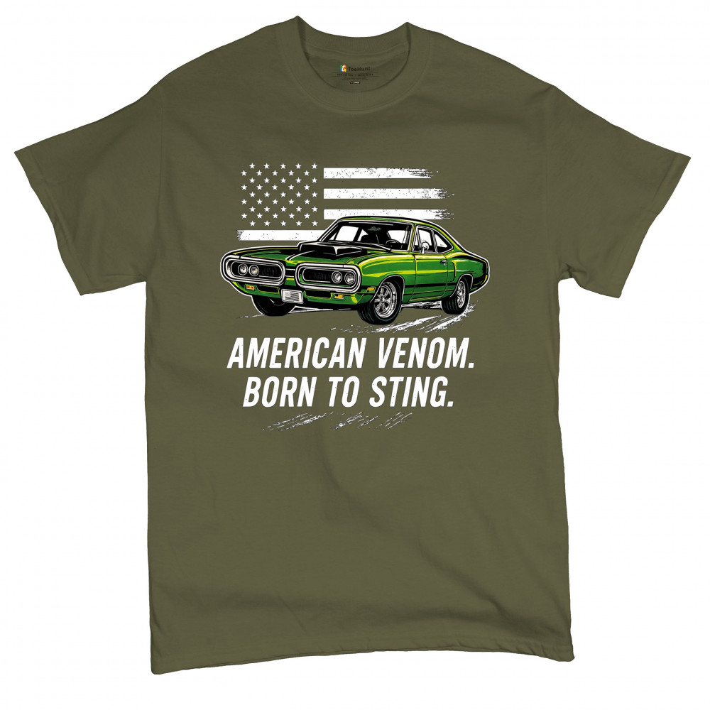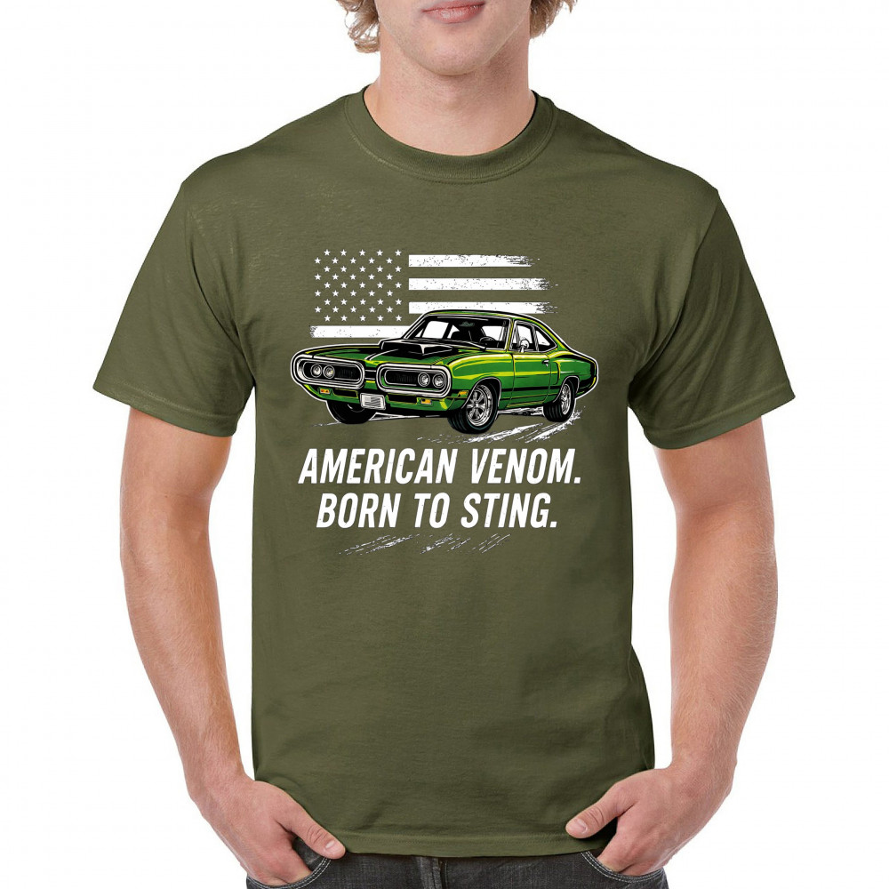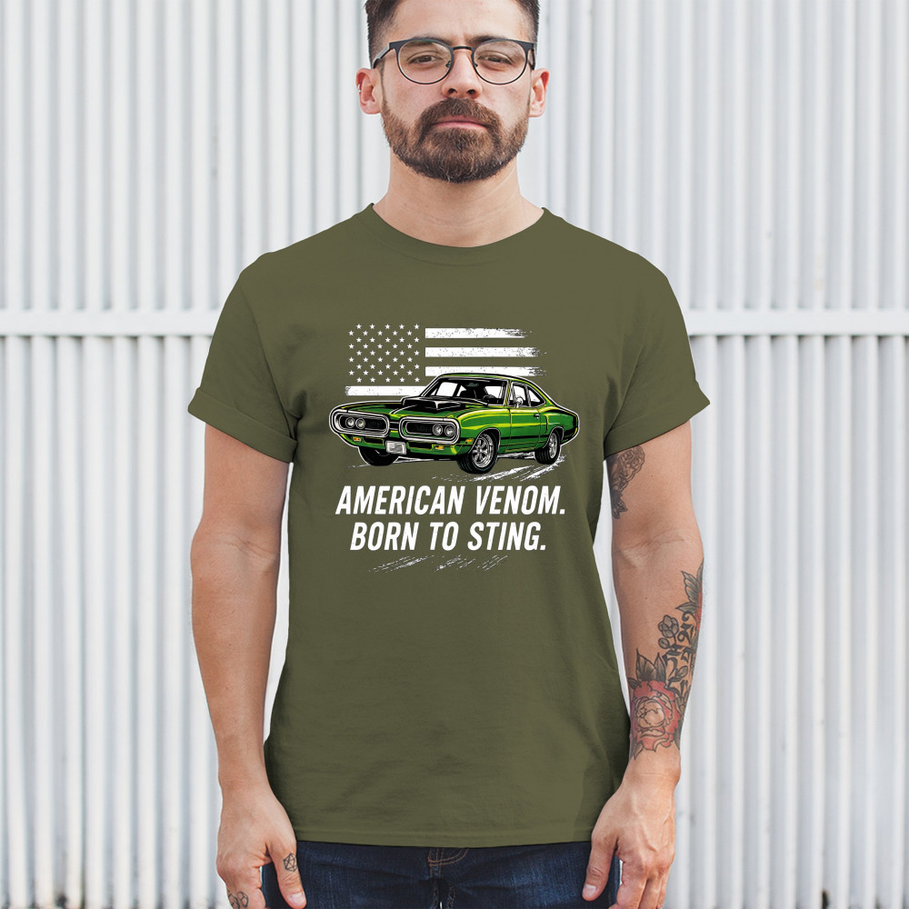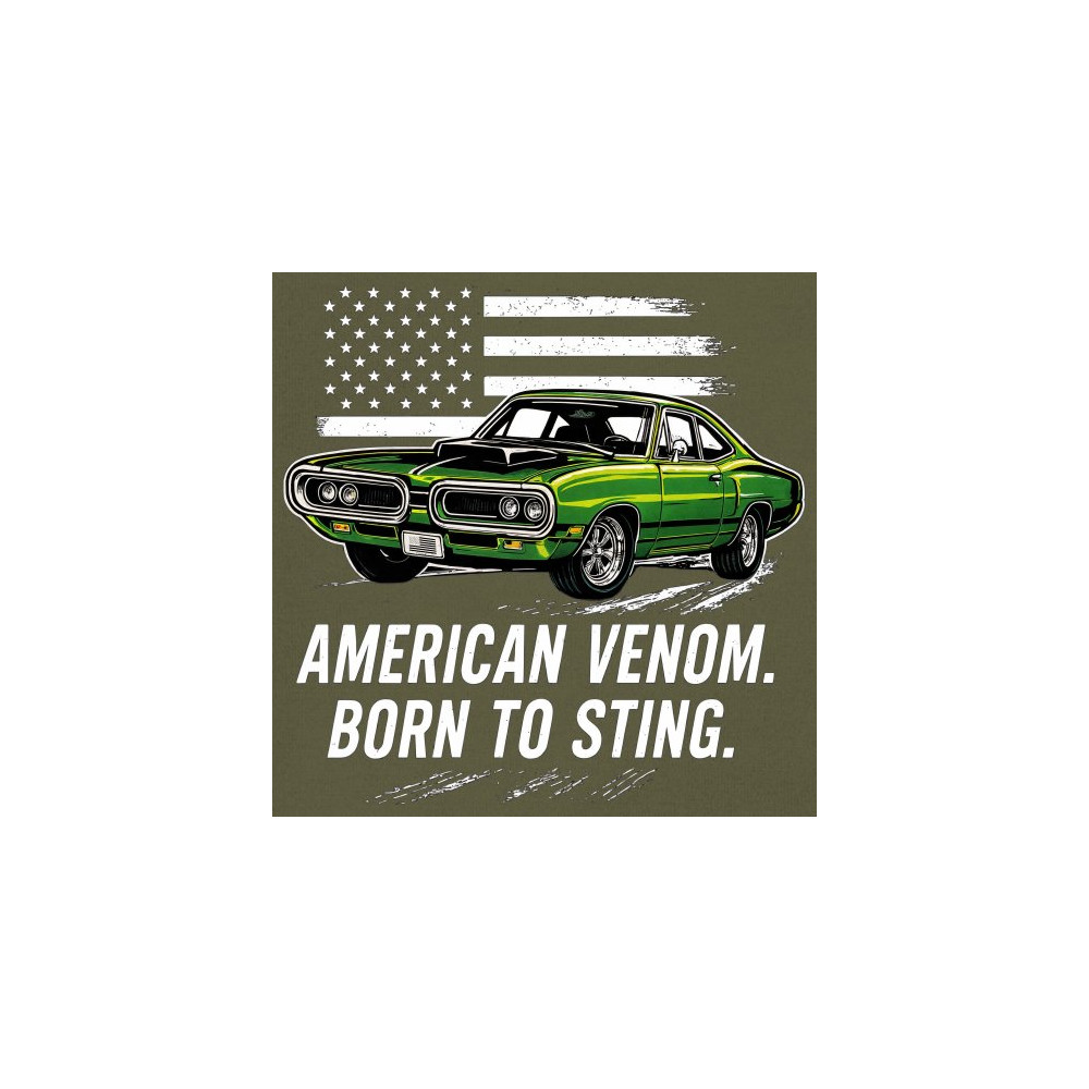 Inject venom into your street style with this bold green muscle car design. With “Born to Sting†power and a backdrop of American pride, this graphic is perfect for Scat fans, gearheads, and drivers who embrace speed, dominance, and the sound of true muscle. Rule car meets, rev battles, and highway runs with unmatched attitude.