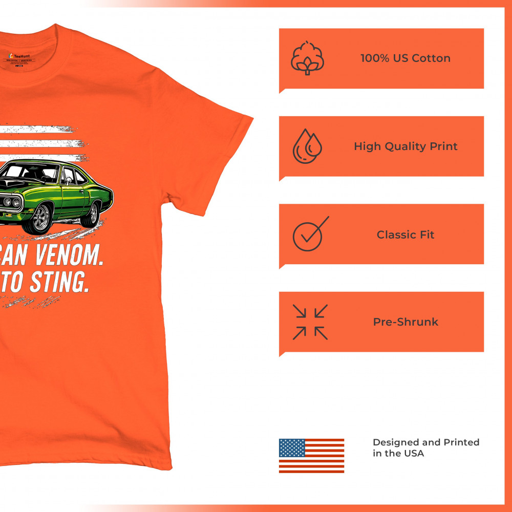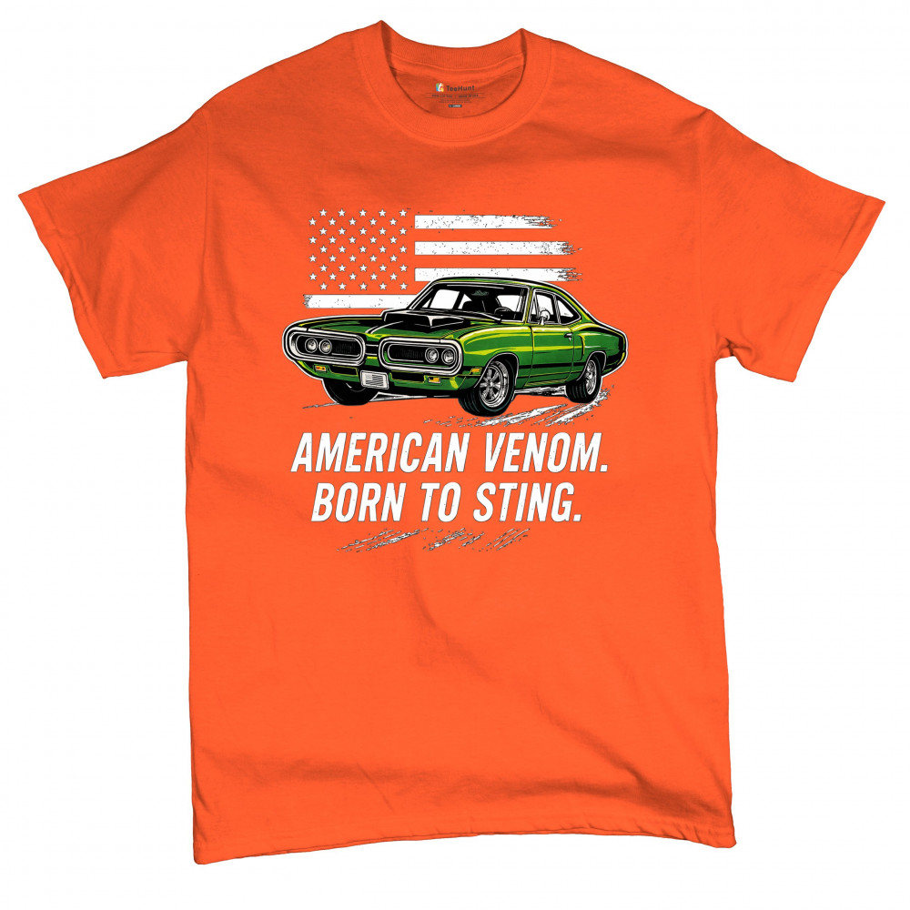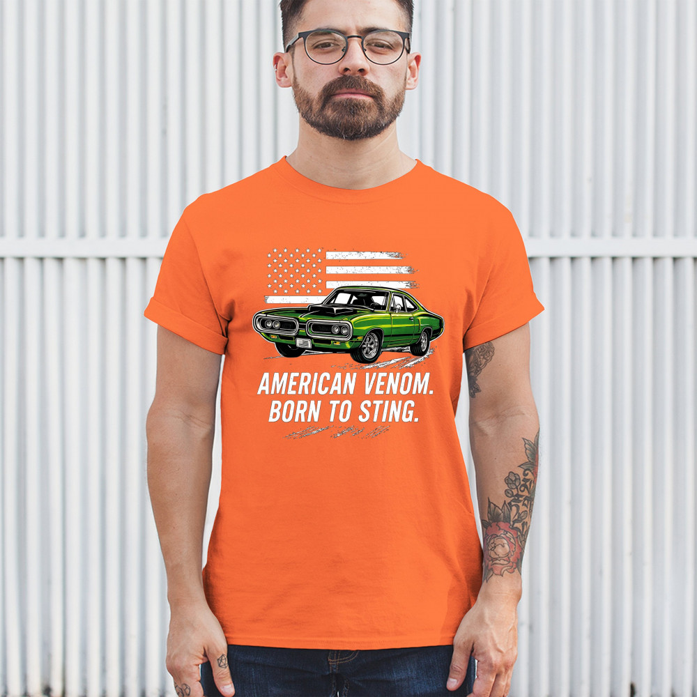 Inject venom into your street style with this bold green muscle car design. With “Born to Sting†power and a backdrop of American pride, this graphic is perfect for Scat fans, gearheads, and drivers who embrace speed, dominance, and the sound of true muscle. Rule car meets, rev battles, and highway runs with unmatched attitude.