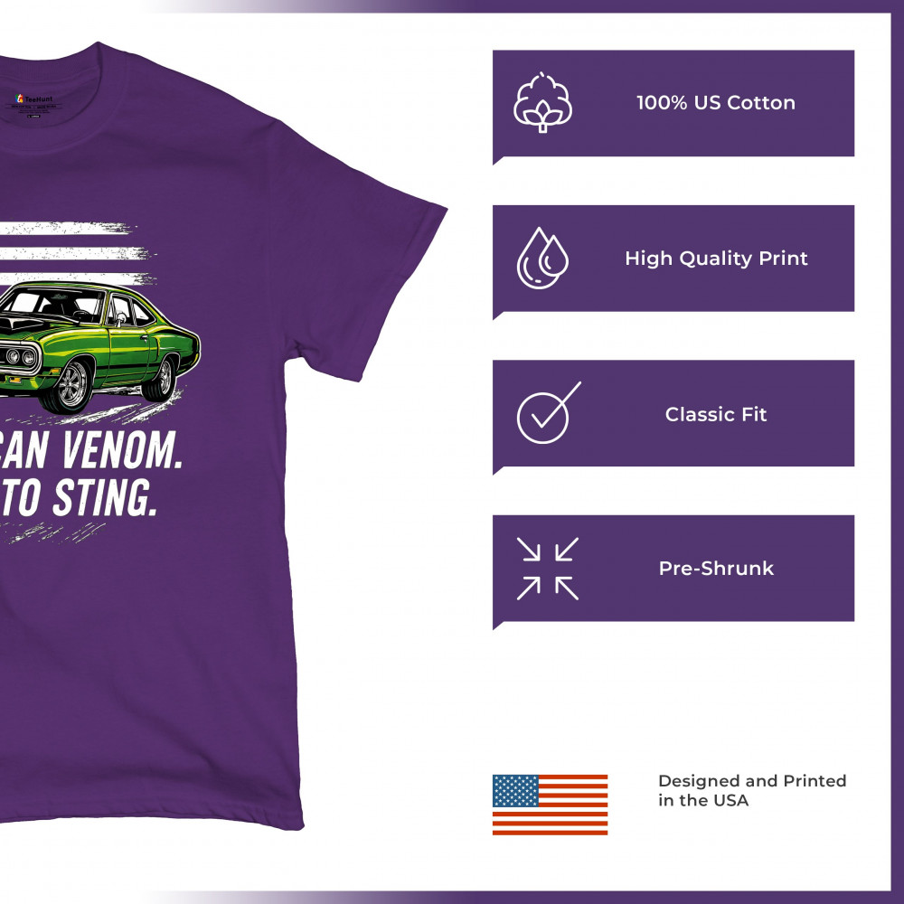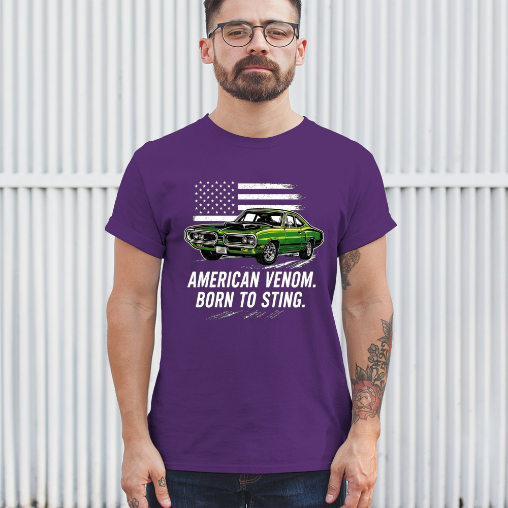 Inject venom into your street style with this bold green muscle car design. With “Born to Sting†power and a backdrop of American pride, this graphic is perfect for Scat fans, gearheads, and drivers who embrace speed, dominance, and the sound of true muscle. Rule car meets, rev battles, and highway runs with unmatched attitude.