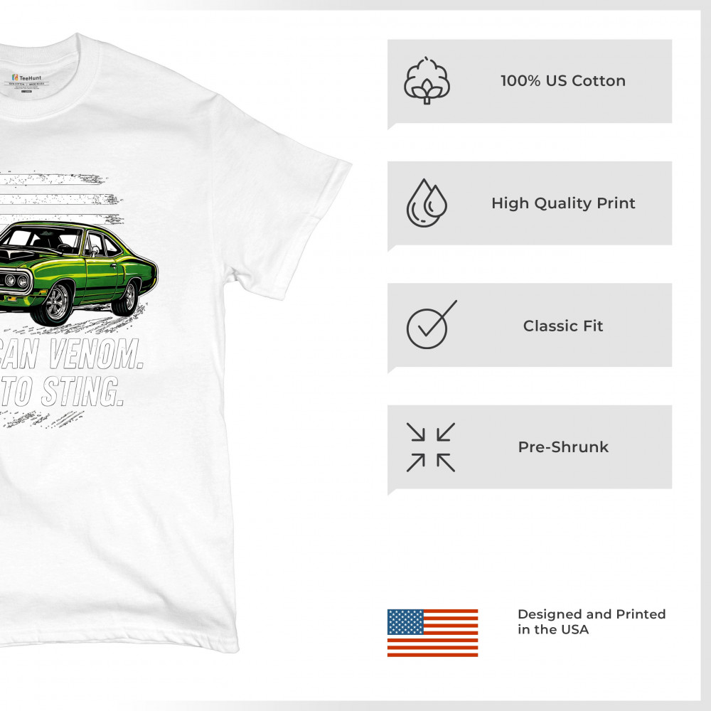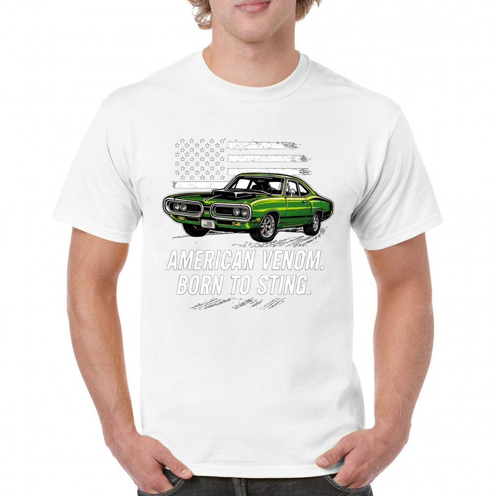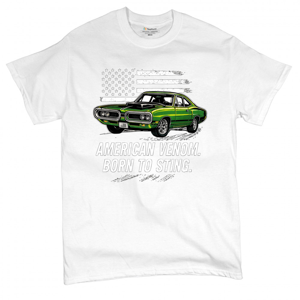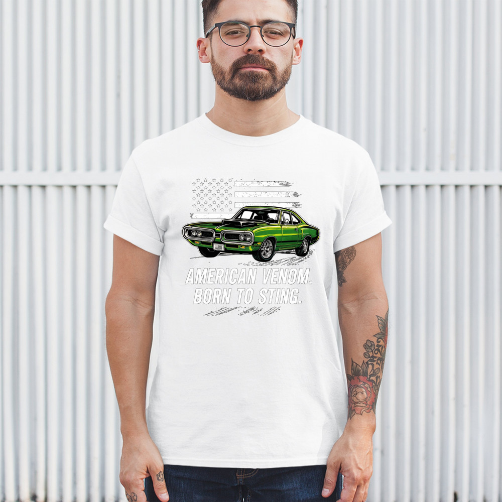 Inject venom into your street style with this bold green muscle car design. With “Born to Sting†power and a backdrop of American pride, this graphic is perfect for Scat fans, gearheads, and drivers who embrace speed, dominance, and the sound of true muscle. Rule car meets, rev battles, and highway runs with unmatched attitude.