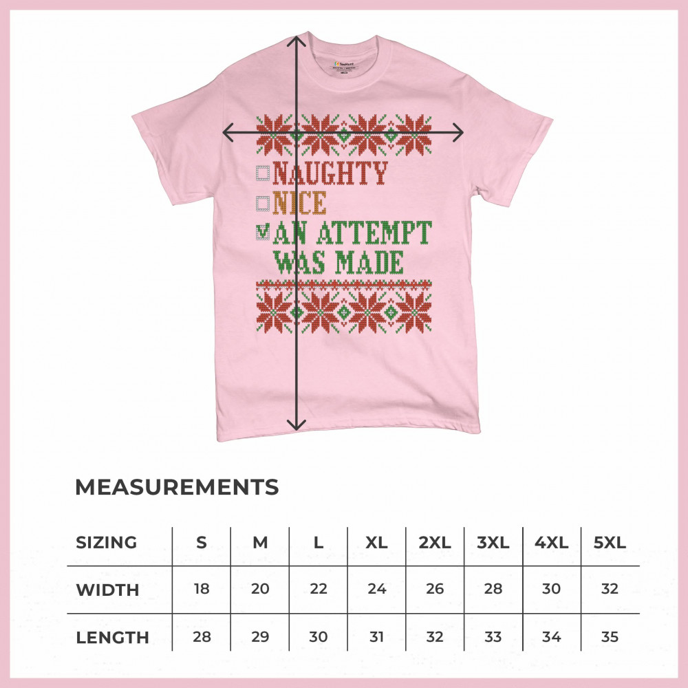 A funny print featuring a check list with options: "Naughty", "Nice" and a checked one "An Attempt Was Made". The print is decorated as an ugly sweater. Amazing choice to make people smile and spread positive vibes on Christmas Eve.