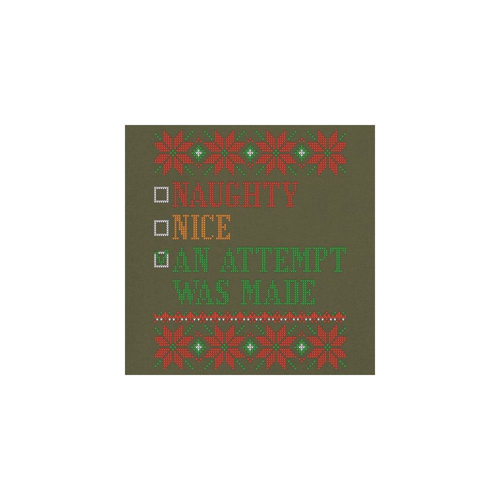 A funny print featuring a check list with options: "Naughty", "Nice" and a checked one "An Attempt Was Made". The print is decorated as an ugly sweater. Amazing choice to make people smile and spread positive vibes on Christmas Eve.