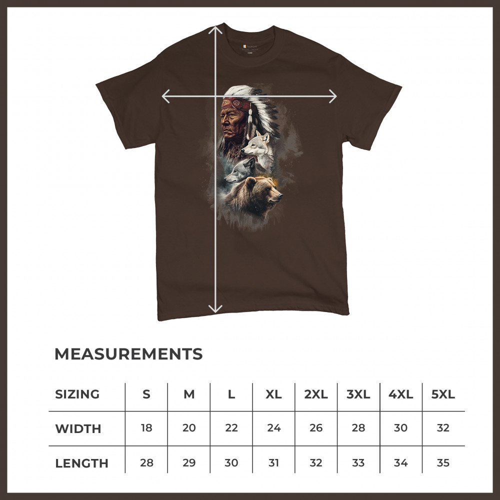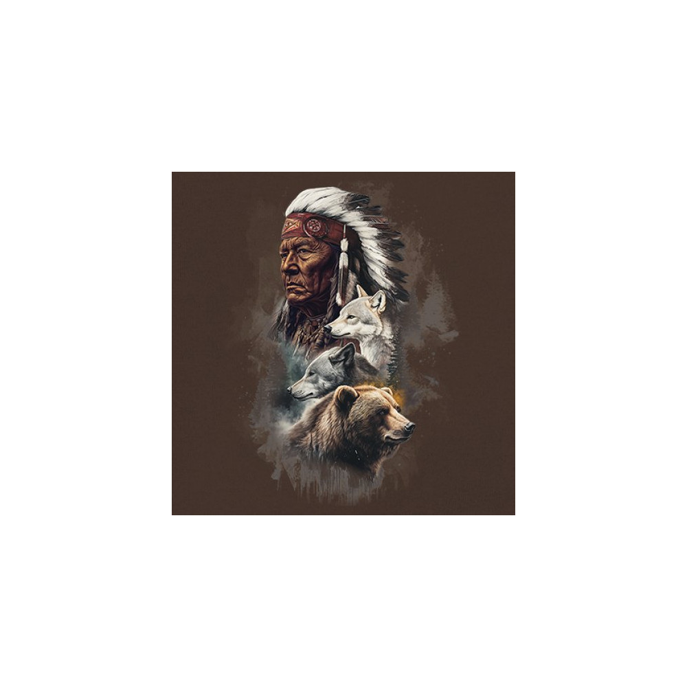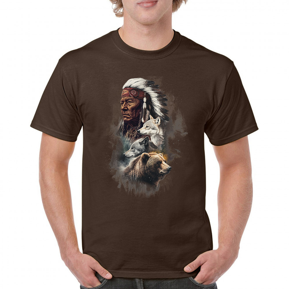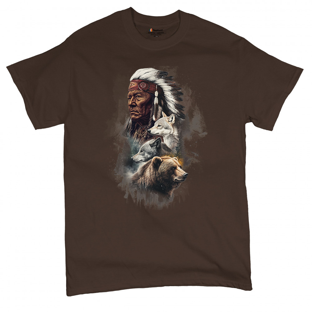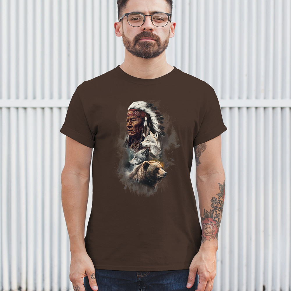 Celebrate spiritual strength and heritage with this design featuring a Native American elder alongside wolves and a bear. This tribal and totemic art reflects wisdom, guardianship, and deep forest spirit energy. Perfect for cultural pride, animal lovers, and those connected to spiritual symbolism in nature.