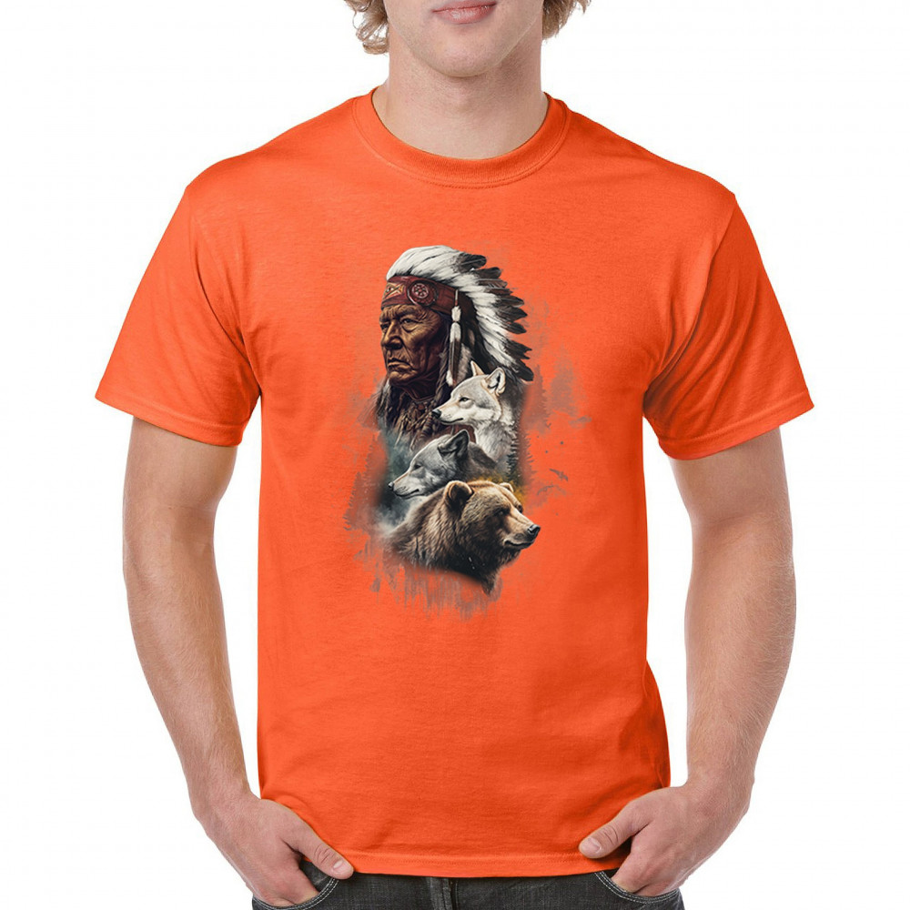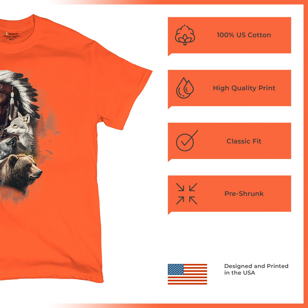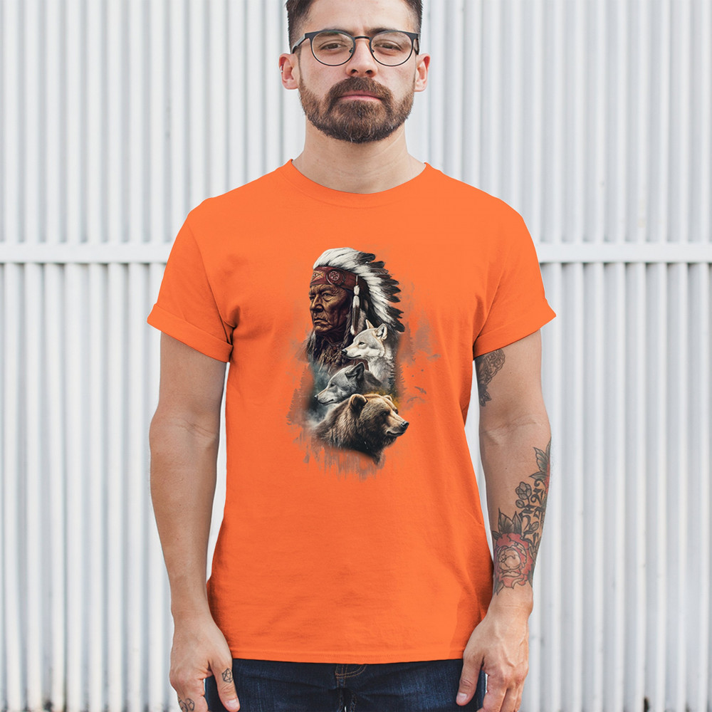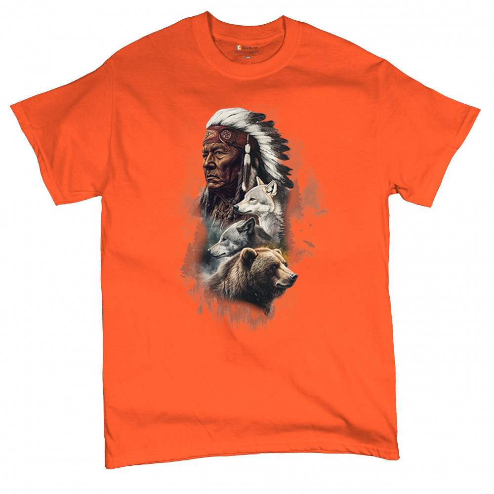 Celebrate spiritual strength and heritage with this design featuring a Native American elder alongside wolves and a bear. This tribal and totemic art reflects wisdom, guardianship, and deep forest spirit energy. Perfect for cultural pride, animal lovers, and those connected to spiritual symbolism in nature.