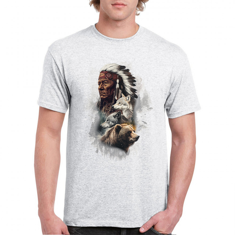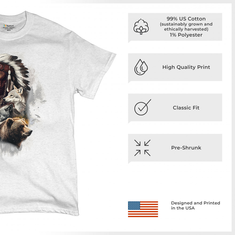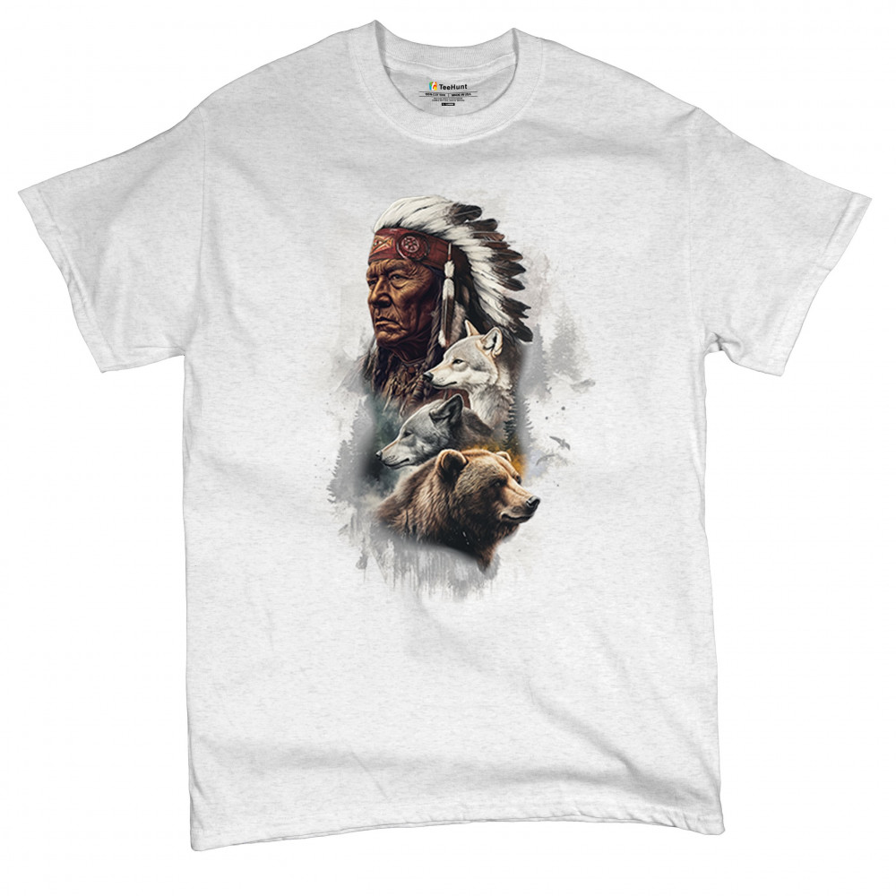 Celebrate spiritual strength and heritage with this design featuring a Native American elder alongside wolves and a bear. This tribal and totemic art reflects wisdom, guardianship, and deep forest spirit energy. Perfect for cultural pride, animal lovers, and those connected to spiritual symbolism in nature.