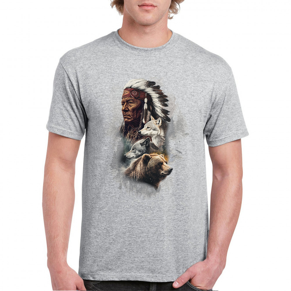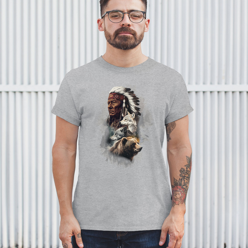 Celebrate spiritual strength and heritage with this design featuring a Native American elder alongside wolves and a bear. This tribal and totemic art reflects wisdom, guardianship, and deep forest spirit energy. Perfect for cultural pride, animal lovers, and those connected to spiritual symbolism in nature.
