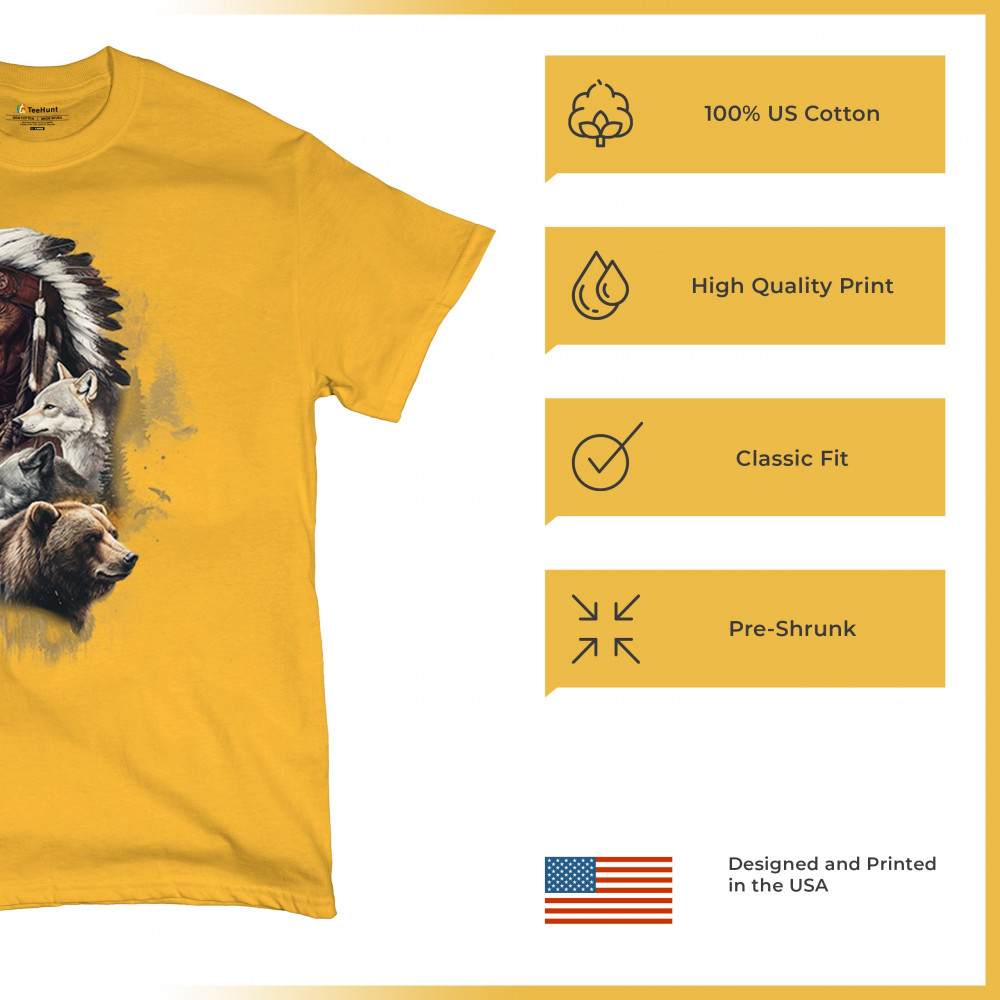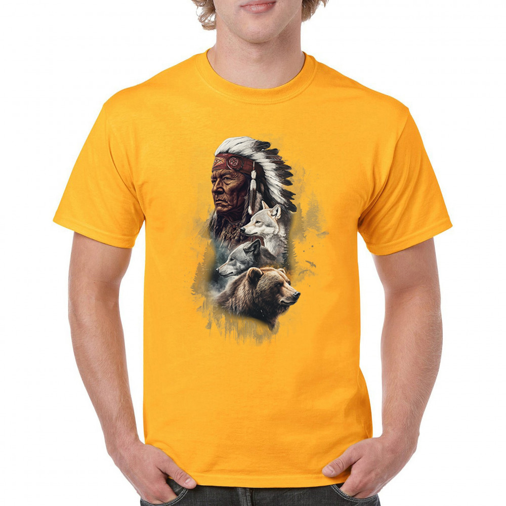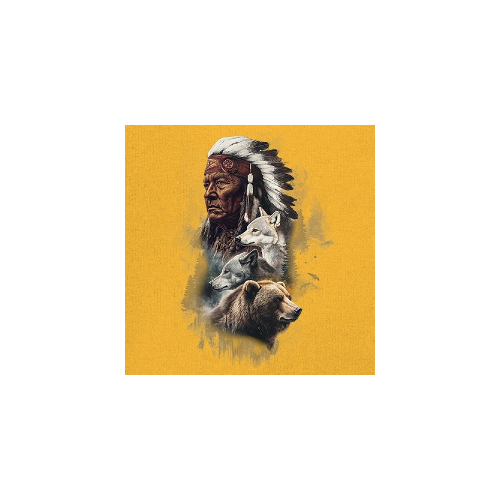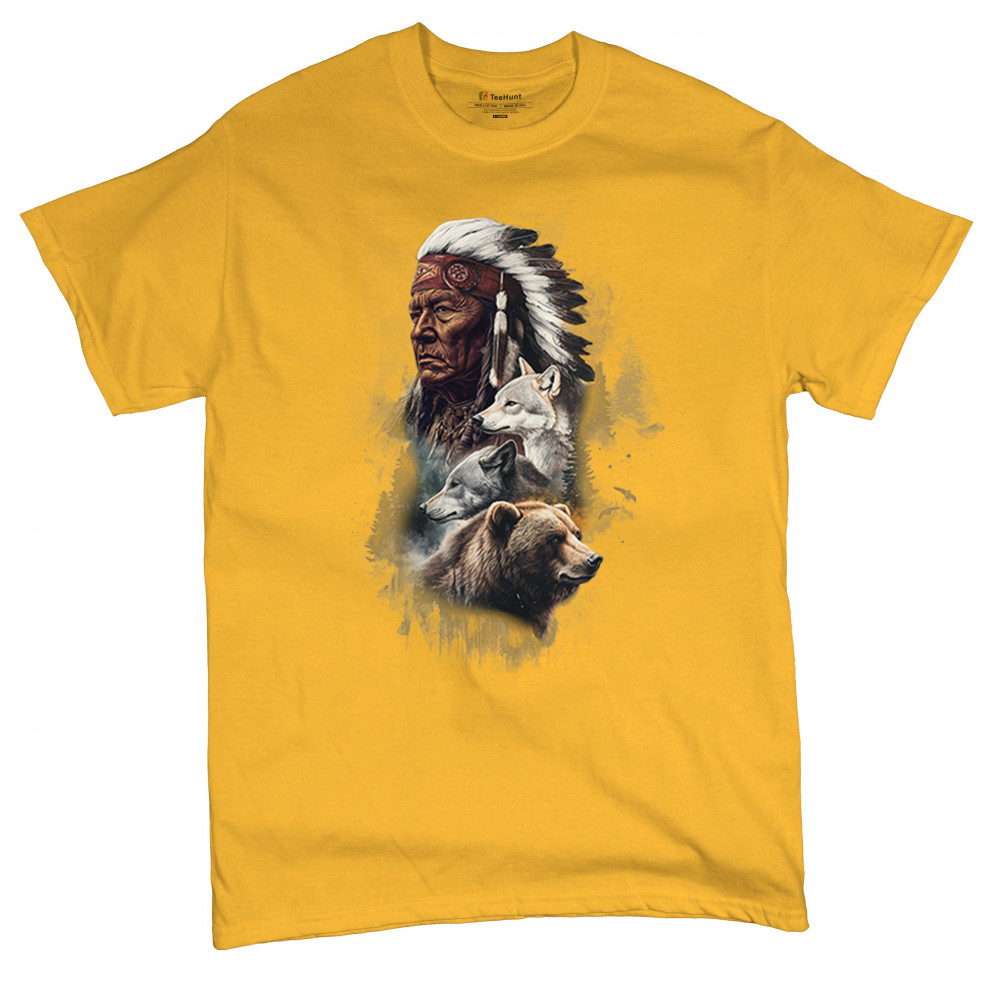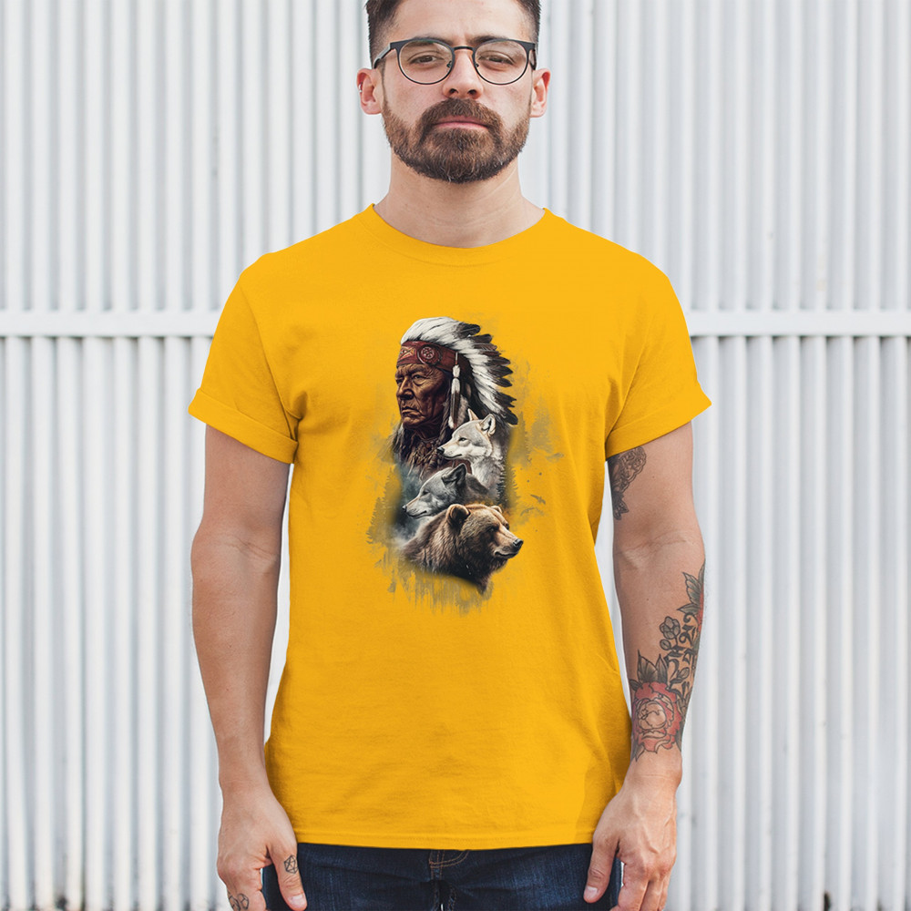 Celebrate spiritual strength and heritage with this design featuring a Native American elder alongside wolves and a bear. This tribal and totemic art reflects wisdom, guardianship, and deep forest spirit energy. Perfect for cultural pride, animal lovers, and those connected to spiritual symbolism in nature.