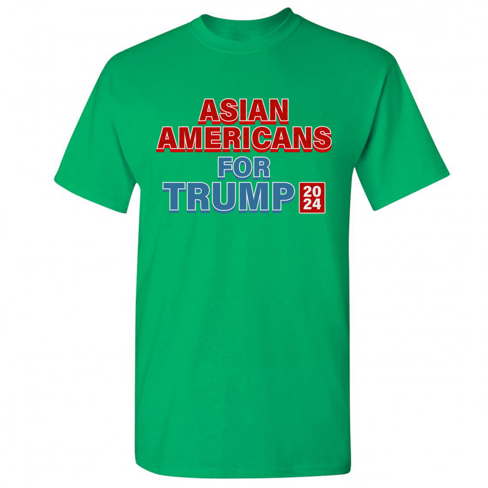A political print saying "Asian Americans for Trump 2024". The words "Asian Americans" and the square with 2024 also have a pattern inside. A great choice to wear for a Trump rally or give as a gift to a Donald Trump supporter before 2024 presidential ele