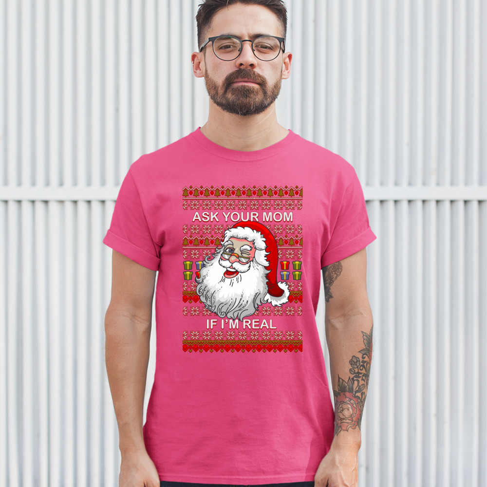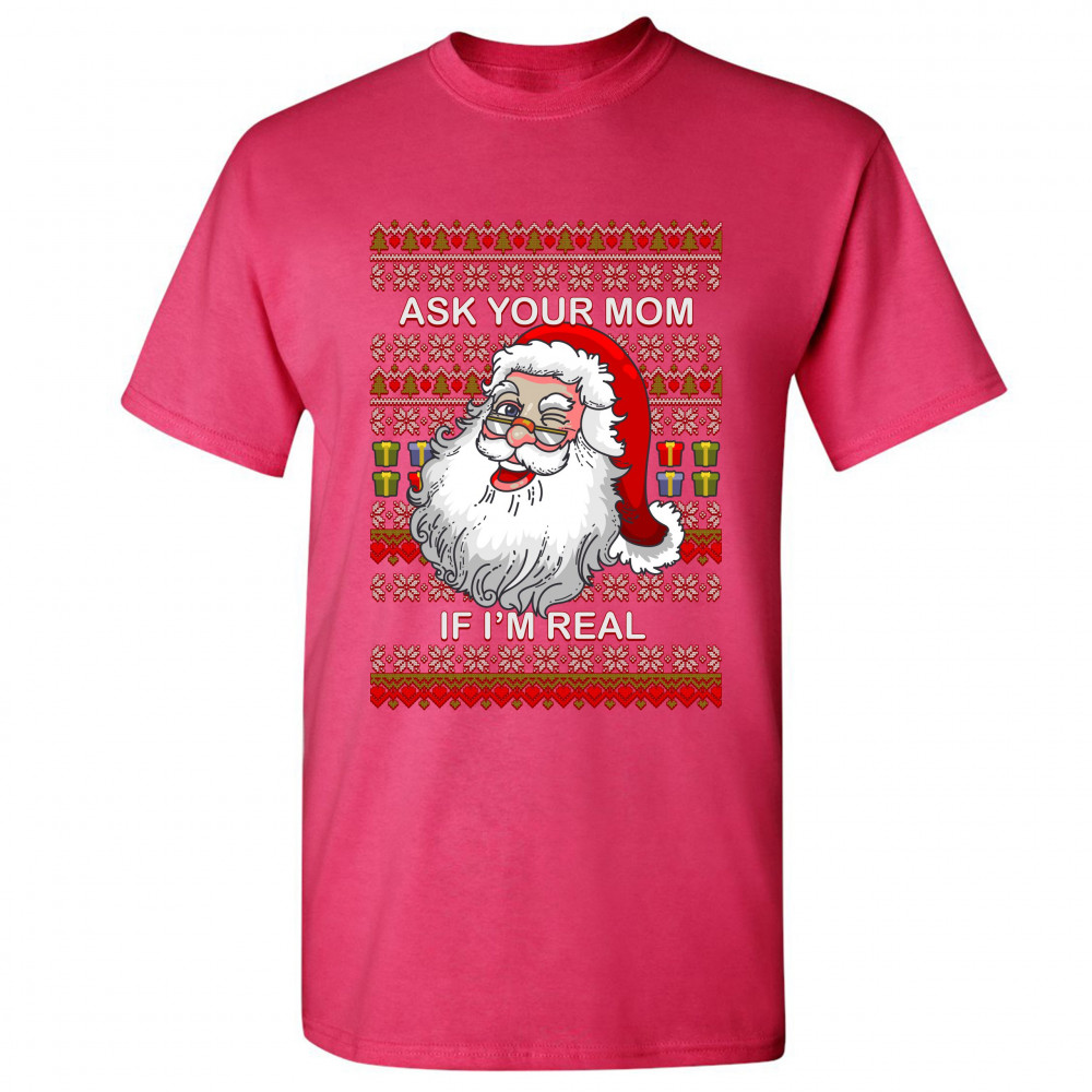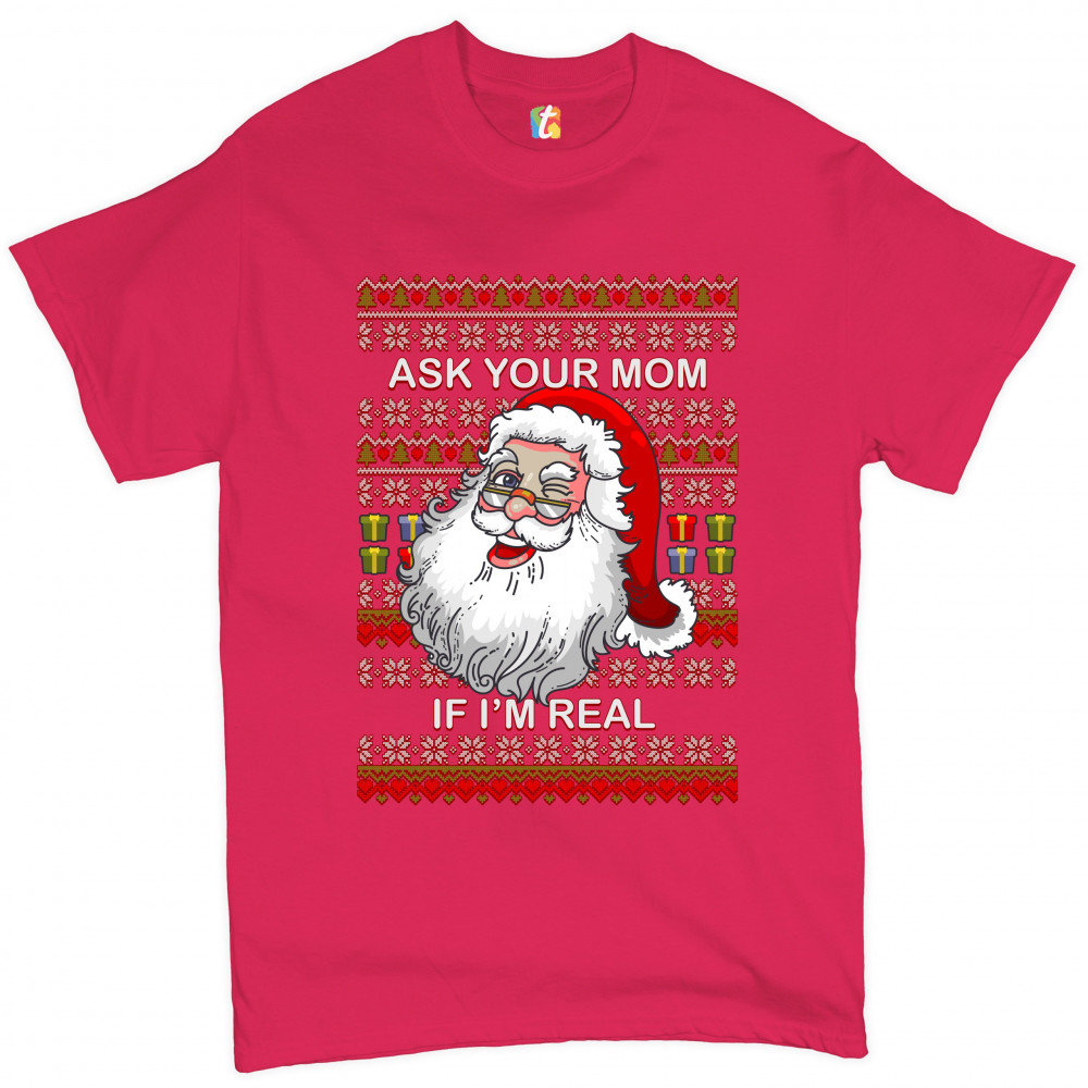 ASK YOUR MOM IF I'M REAL t-shirt ugly sweater christmas santa claus men's tee hot pink