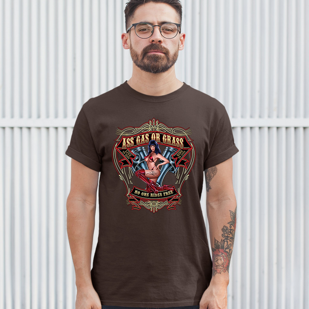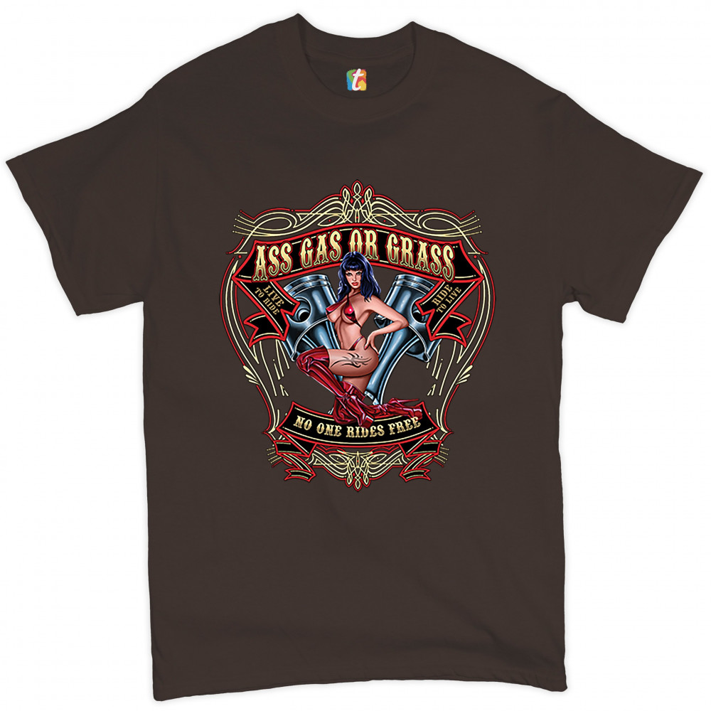 A print featuring a sexy girl in high heels. On multiple stripes or signs the print says: "Ass Gas or Grass, Live to Ride, Ride to Live, No One Rides Free". There are huge pistons in the background. A great choice for a motorcycle enthusiast.