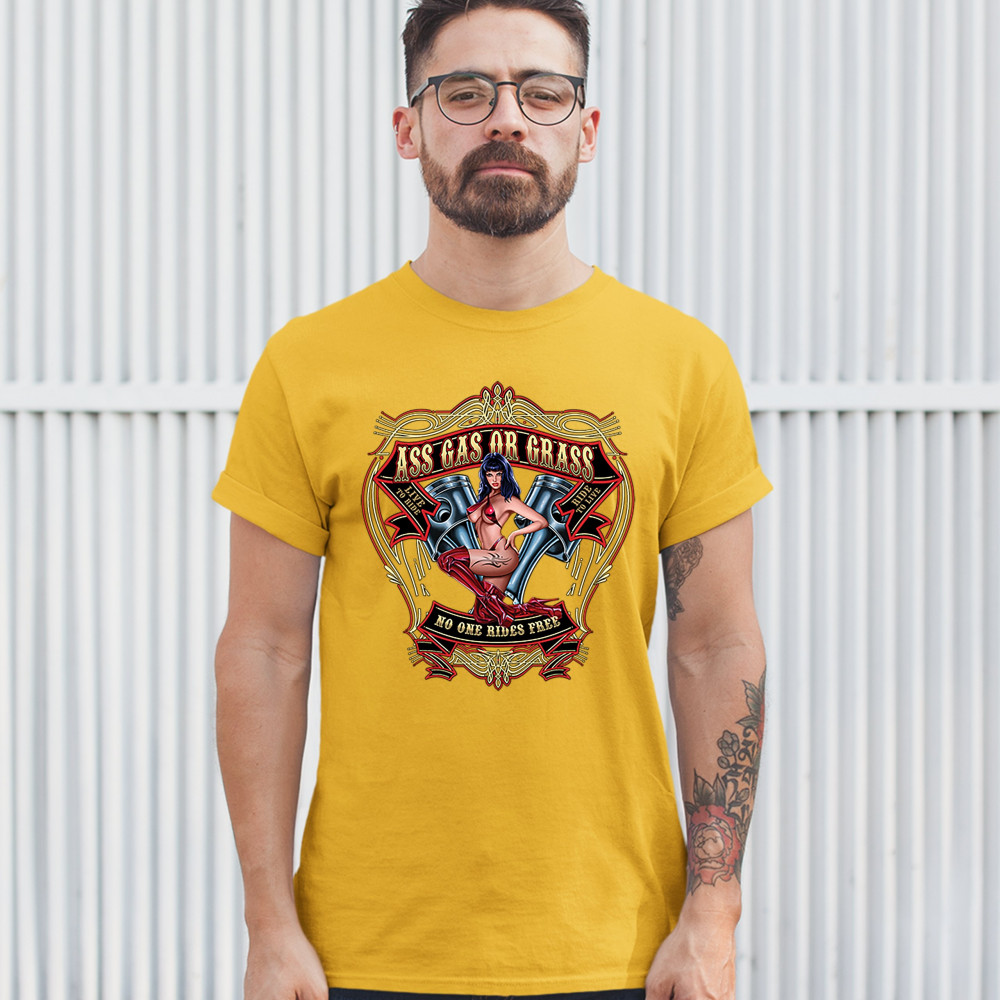 ASS GAS OR GRASS t-shirt biker no one rides free live to ride men's tee yellow
