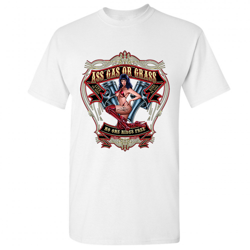 A print featuring a sexy girl in high heels. On multiple stripes or signs the print says: "Ass Gas or Grass, Live to Ride, Ride to Live, No One Rides Free". There are huge pistons in the background. A great choice for a motorcycle enthusiast.