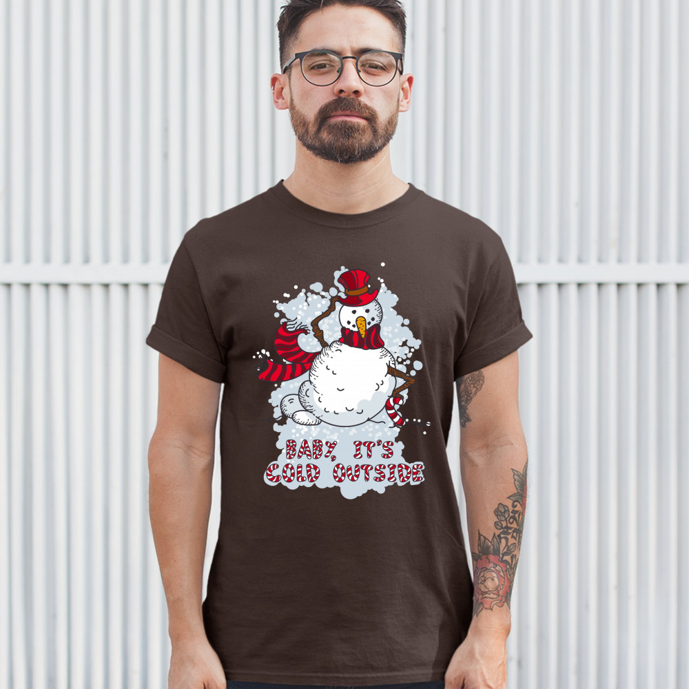 BABY, IT'S COLD OUTSIDE t-shirt merry christmas snowman candy cane men's tee brown