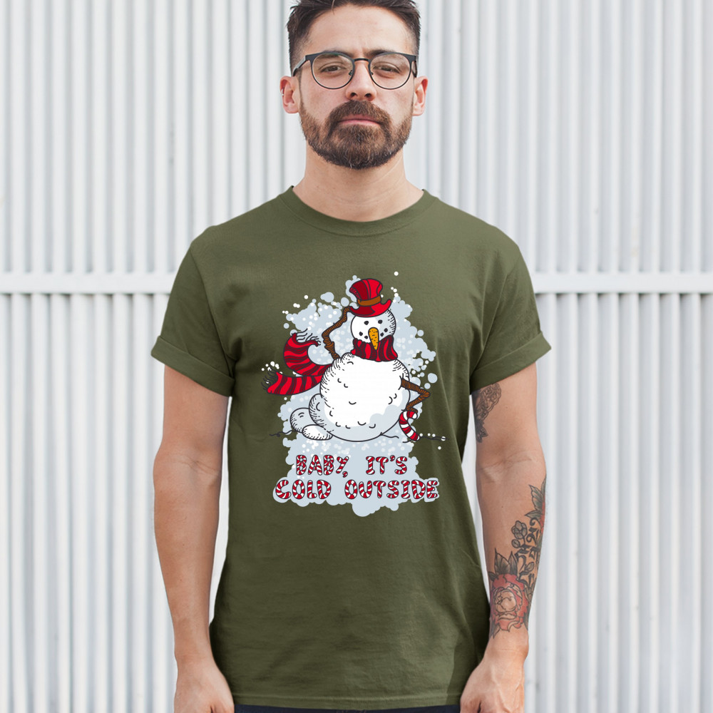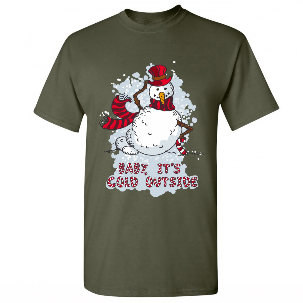 BABY, IT'S COLD OUTSIDE t-shirt merry christmas snowman candy cane men's tee military green