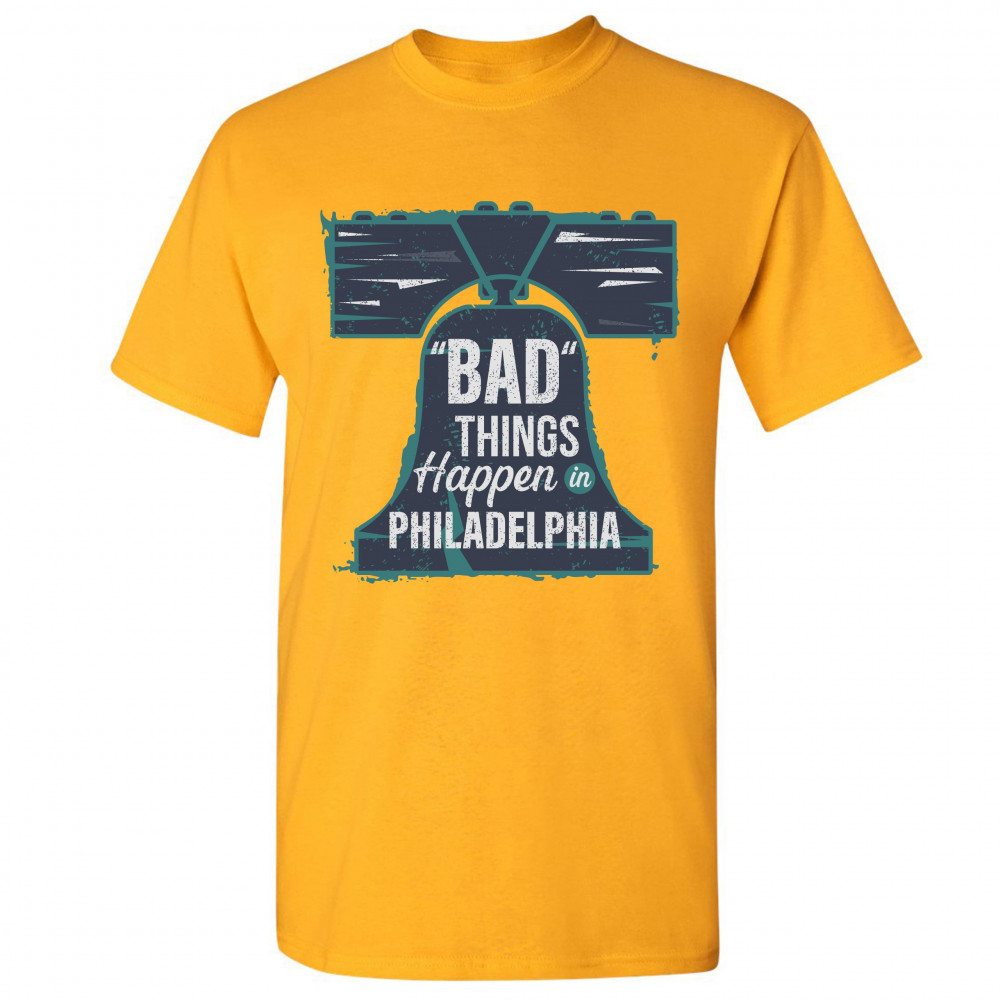 A funny print featuring the famous Liberty Bell located in Philadelphia, Pennsylvania. On the Bell it is written: "Bad things happen in Philadelphia". The word "bad" is in air quotes. It is a great choice for anyone who closely follows politics.