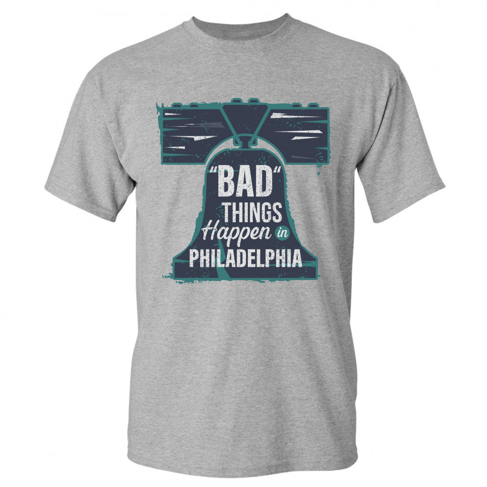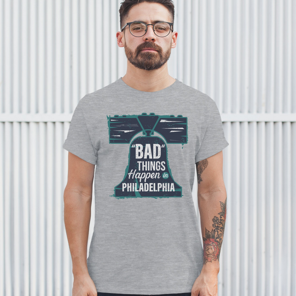 A funny print featuring the famous Liberty Bell located in Philadelphia, Pennsylvania. On the Bell it is written: "Bad things happen in Philadelphia". The word "bad" is in air quotes. It is a great choice for anyone who closely follows politics.