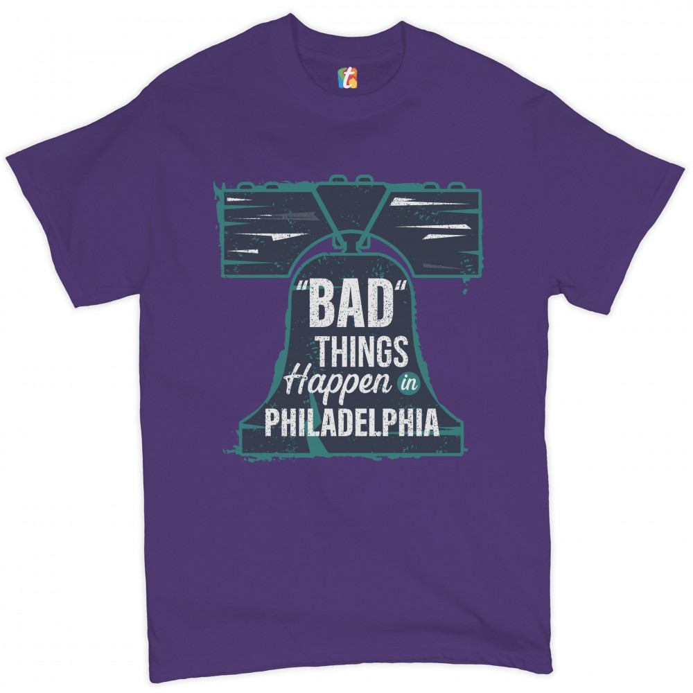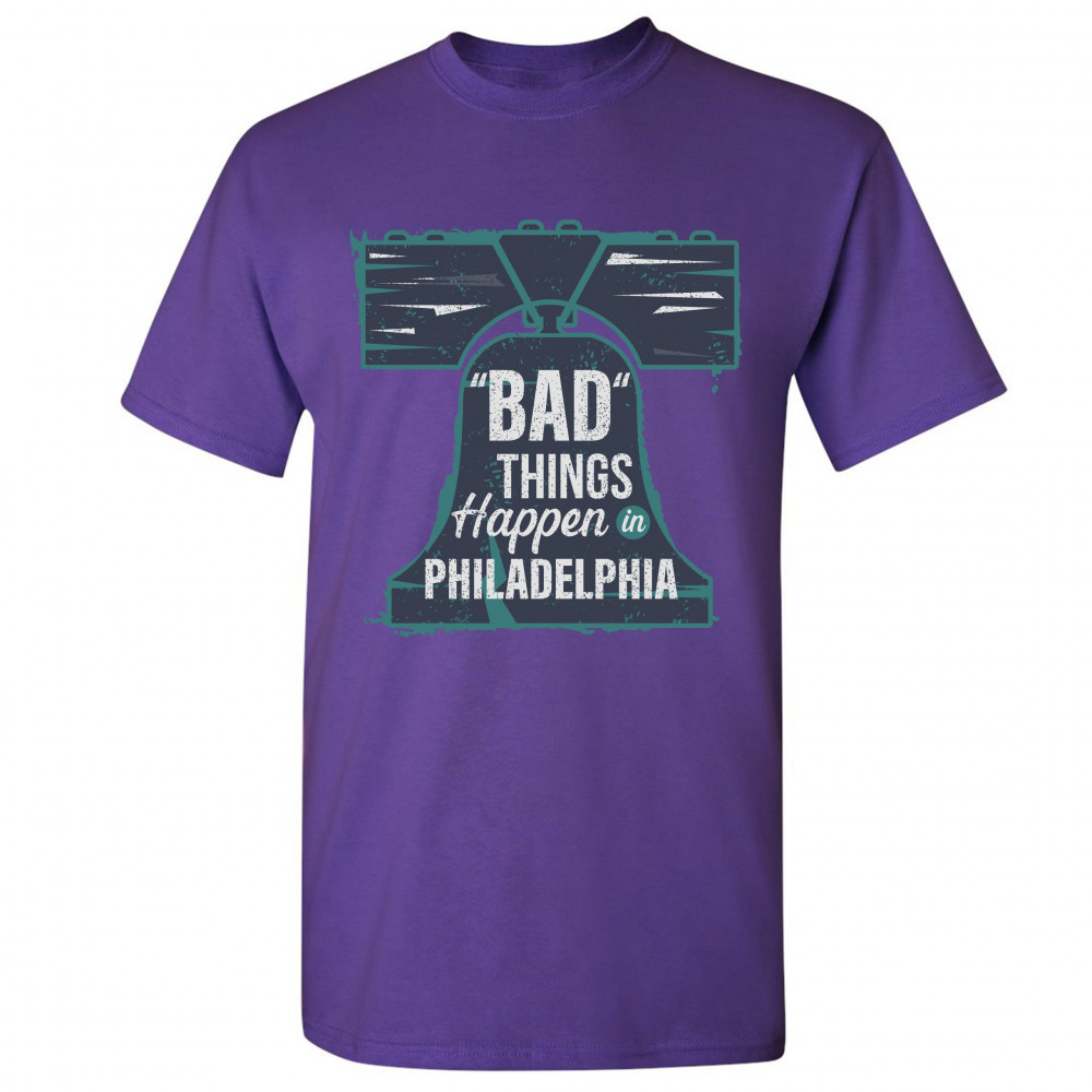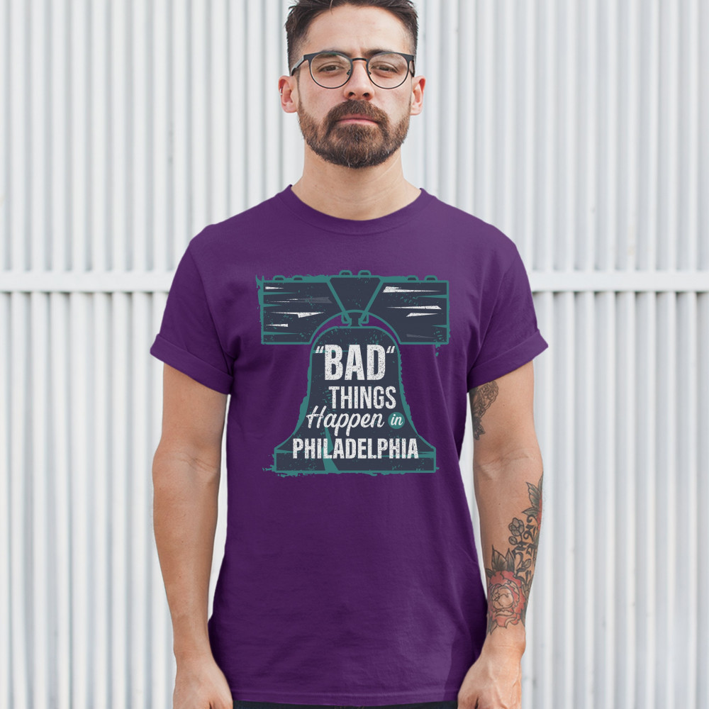 A funny print featuring the famous Liberty Bell located in Philadelphia, Pennsylvania. On the Bell it is written: "Bad things happen in Philadelphia". The word "bad" is in air quotes. It is a great choice for anyone who closely follows politics.
