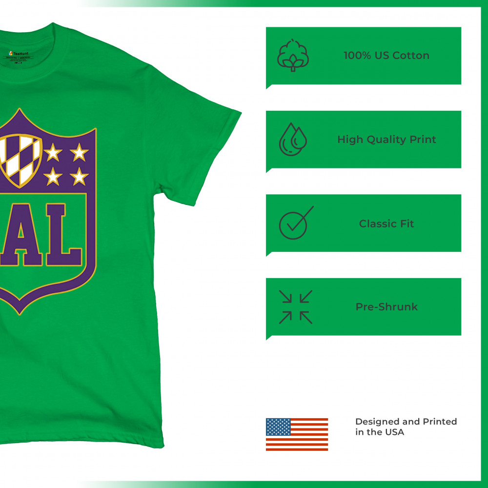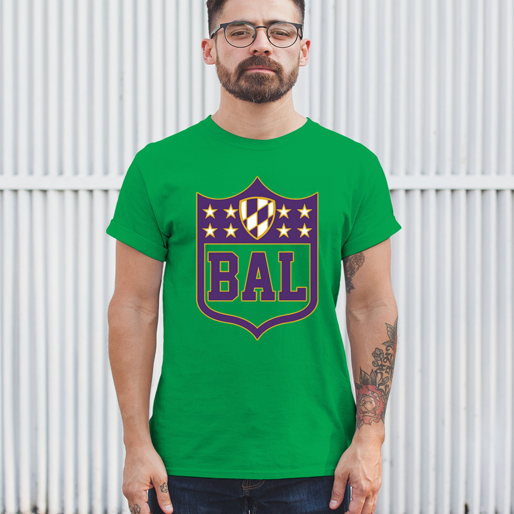 Celebrate your Baltimore pride with this bold BAL shield design. Perfect for football season, this Baltimore athletic shirt blends retro Baltimore football shirt style with collegiate energy. From tailgate party Baltimore tees to vintage BAL sports shirts, it’s built for fans who thrive on touchdown vibes, football culture, and Baltimore city pride. A shield logo Baltimore shirt every fan will love.